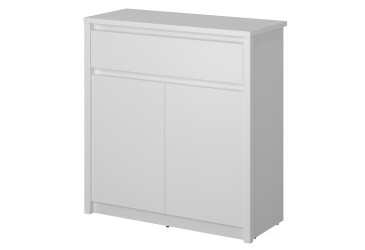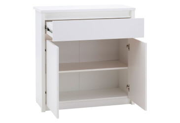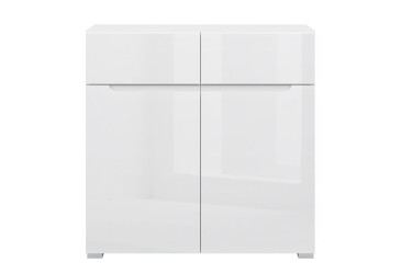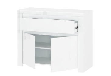 - super-cena, skladom, MDF, lesklá, s dvierkami, biely lesk, guličkové vedenie plného výsuvu, 1 zásuvka, drevotrieska, moderný štýl.