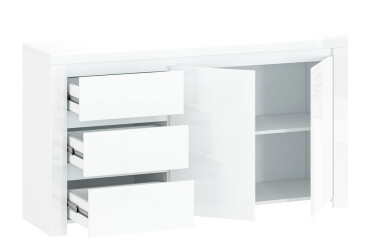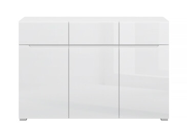 - super-cena, MDF, lesklá, s dvierkami, biely lesk, guličkové vedenie plného výsuvu, 3 zásuvky, drevotrieska, moderný štýl.