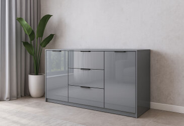 - super-cena, drevotrieska, lesklá, so zásuvkami, s dvierkami, lesklý sivý lávový, guličkové vedenie plného výsuvu, 3 zásuvky, drevotrieska.