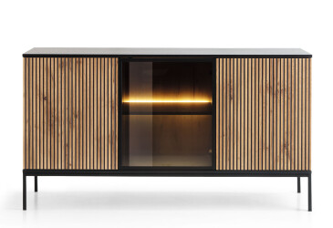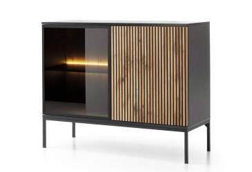 - super-cena, MDF, dodávané s osvetlením, laminovaná, vitrína, s dvierkami, čierny / dub wotan, 3 zásuvky, drevotrieska, moderný štýl.