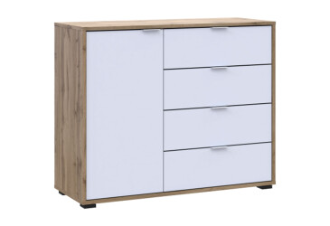 - super-cena, skladom, drevotrieska, laminovaná, s dvierkami, dub taho / biely, guličkové vedenie plného výsuvu, 4 zásuvky, drevotrieska, moderný štýl.