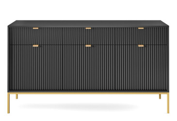 - super-cena, MDF, matná, s dvierkami, čierny, zlatý / šedý, guličkové vedenie plného výsuvu, 3 zásuvky, drevotrieska, škandinávsky štýl.