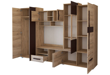 • super-cena, MDF, dodávané s osvetlením, laminovaná, s presklenými dvierkami, čierny / dub wotan, guličkové vedenie plného výsuvu, drevotrieska, moderný štýl.