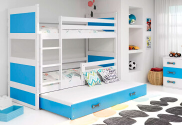 - super-cena, 80x200 cm, 3 miesta na spanie, drevo, lakovaná, biely / svetlo modrý, s úložným priestorom, s roštom, MDF.