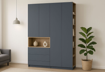 - super-cena, drevotrieska, laminovaná, grafit / dub evok, guličkové vedenie plného výsuvu, drevotrieska, polica, tyč, zásuvky, moderný štýl.