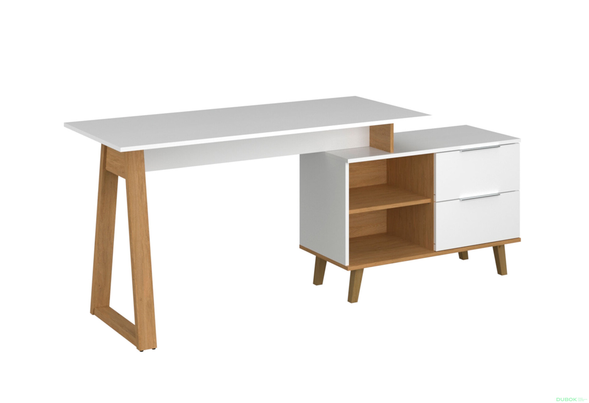 Kancelársky stôl (B) biely / dub kamenný Neptún je ideálnym riešením pre všetkých, ktorí hľadajú moderný a funkčný nábytok do svojej kancelárie alebo pracovného priestoru. Tento stôl v škandinávskom štýle kombinuje elegantný dizajn s praktickými vlastnosťami, ktoré uľahčujú organizáciu a prácu. S úložným priestorom v podobe zásuviek a poličky ponúka dostatok miesta na uskladnenie všetkých potrebných dokumentov a kancelárskych potrieb. Povrchová úprava z laminovanej drevotriesky zabezpečuje odolnosť a jednoduchú údržbu, zatiaľ čo biely dekor v kombinácii s dubom kamenným dodáva priestoru svetlosť a útulnosť.