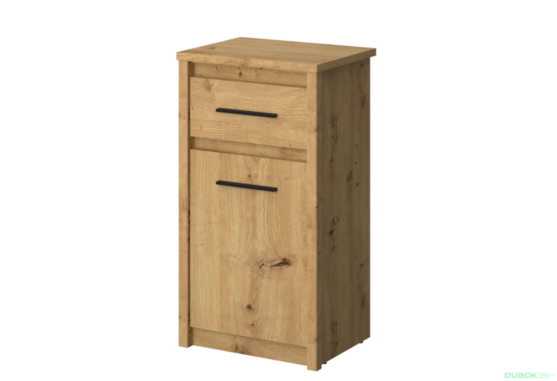 Komoda 1d1s dub artisan Ayson je ideálnym riešením pre tých, ktorí hľadajú moderný a funkčný nábytok do svojho interiéru. S rozmermi 47 cm na šírku, 86,5 cm na výšku a 36,5 cm na hĺbku sa skvele hodí do menších priestorov, pričom ponúka dostatok úložného priestoru. Jej elegantný škandinávsky štýl a dekor dub artisan dodávajú miestnosti príjemný a útulný vzhľad. Komoda je vybavená jednou zásuvkou a dvierkami, čo zaručuje jednoduchý prístup k uskladneným veciam. Kovová úchytka a guličkové vedenie plného výsuvu zásuviek zaisťujú pohodlné a bezproblémové používanie. Laminovaný povrch zabezpečuje odolnosť voči poškodeniu a jednoduchú údržbu, čo oceníte pri každodennom používaní.