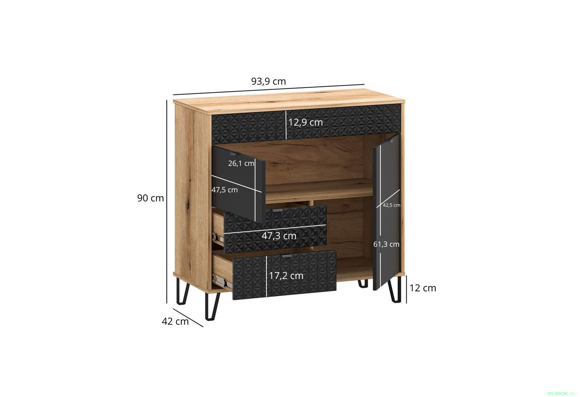 Komoda 2d2s (E) dub evok / čierny Bellano je moderný a praktický kus nábytku, ktorý sa skvele hodí do každého interiéru. S rozmermi 94 cm na šírku, 90 cm na výšku a 40 cm na hĺbku ponúka dostatok úložného priestoru v dvoch zásuvkách a dvoch dvierkach. Jej elegantný dizajn v kombinácii s dekorom evokujúceho duba a čiernej farby dodáva priestoru nadčasový vzhľad. Komoda je vyrobená z kvalitnej drevotriesky s laminovanou povrchovou úpravou, čo zabezpečuje jej odolnosť a jednoduchú údržbu. Kovové nohy a úchytky pridávajú na stabilite a modernom štýle, pričom guličkové vedenie plného výsuvu zásuviek zaručuje ich hladké a tiché otváranie.