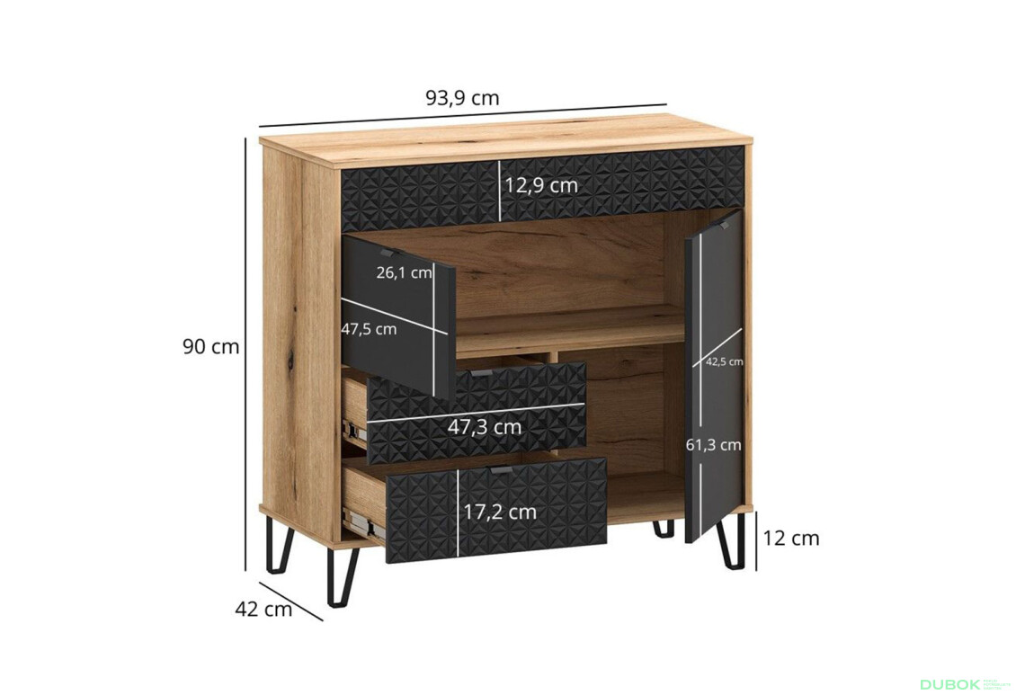 - Veľkosť. S rozmermi 94 cm x 90 cm x 40 cm je komoda ideálna pre rôzne priestory, čím sa stáva praktickým riešením pre úložný priestor.