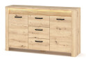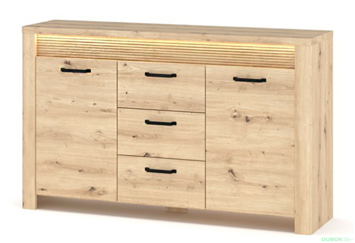 Komoda 2d3s dub artisan Moris je moderný kus nábytku, ktorý spojuje funkčnosť s elegantným dizajnom. S rozmermi 152 cm na šírku, 92 cm na výšku a 40 cm na hĺbku ponúka dostatok úložného priestoru v podobe troch zásuviek a dvoch dvierok. Tento kúsok je ideálny pre obývacie izby, kde sa vyžaduje nielen praktickosť, ale aj estetická hodnota. Je vyrobený z kvalitnej drevotriesky s laminovanou povrchovou úpravou, čo zaručuje jeho odolnosť a jednoduchú údržbu. Komoda je vybavená rolovacími vodičmi zásuviek, čo zaisťuje ich hladké a tiché otváranie. Okrem toho je dodávaná s LED osvetlením, ktoré dodáva priestoru príjemnú atmosféru.