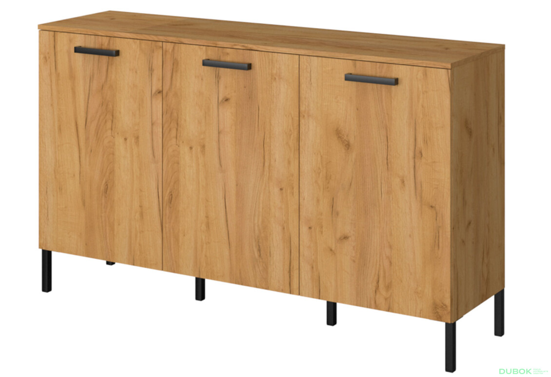 Komoda 3d dub craft zlatý / antracit Santes je moderný a funkčný nábytok, ktorý skvele zapadne do vášho interiéru v štýle loft. S rozmermi 155 cm na šírku, 92 cm na výšku a 42 cm na hĺbku ponúka dostatok úložného priestoru pre vaše osobné veci, dokumenty alebo dekorácie. Jej elegantný dizajn v kombinácii s praktickými dvierkami zabezpečuje, že všetko, čo potrebujete, bude vždy na dosah ruky, ale skryté pred zrakmi návštevníkov. Komoda je vyrobená z kvalitnej drevotriesky s laminovanou povrchovou úpravou, čo zaručuje jej dlhú životnosť a jednoduchú údržbu. Kovové nohy dodávajú komode stabilitu a moderný vzhľad, zatiaľ čo plastové úchytky sú praktické a funkčné.