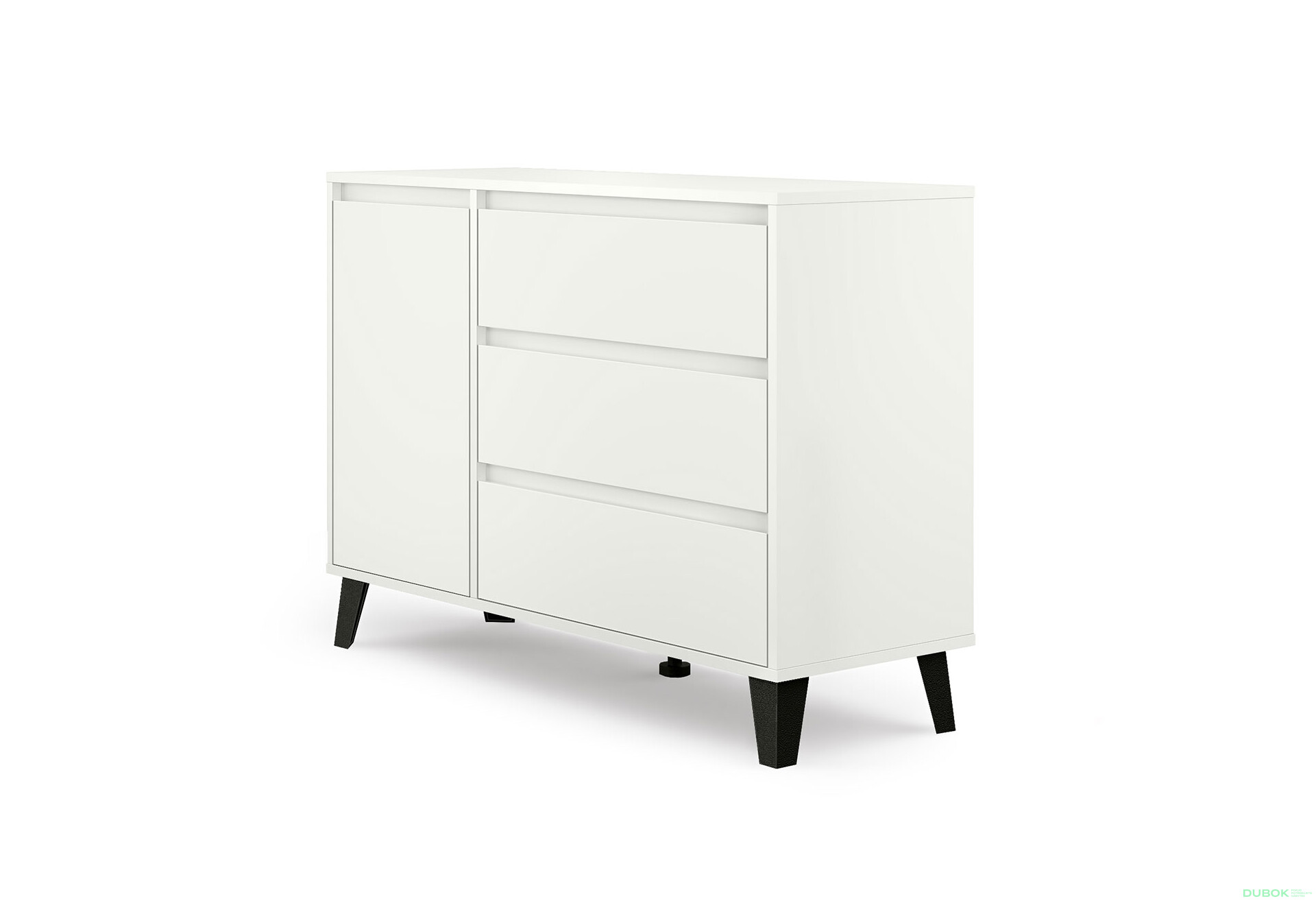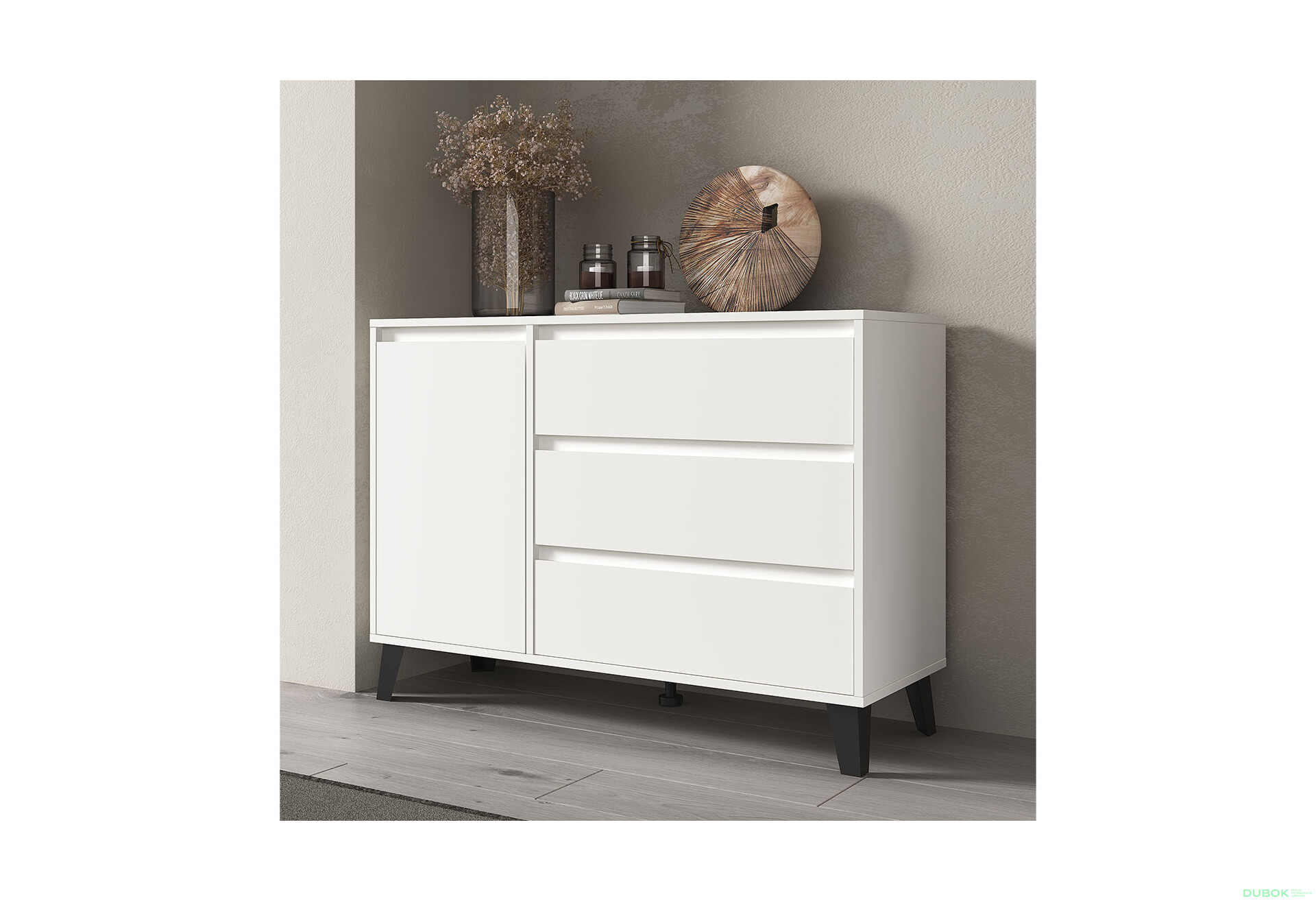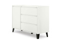 Komoda Borg 1d3s biela je ideálnym riešením pre tých, ktorí hľadajú moderný a funkčný nábytok do svojho domova. S rozmermi 110 cm na šírku, 78,4 cm na výšku a 38,8 cm na hĺbku ponúka dostatok úložného priestoru v podobe troch zásuviek a dvierok, pričom jej minimalistický dizajn skvele zapadne do každého interiéru. Vyrobená z kvalitnej drevotriesky s laminovanou povrchovou úpravou, komoda je odolná a ľahko sa udržuje. Guličkové vedenie plného výsuvu zabezpečuje plynulé otváranie zásuviek, čo zvyšuje komfort pri používaní. Plastové nohy dodávajú stabilitu a moderný vzhľad, čím sa stáva praktickým a štýlovým doplnkom vášho domova.