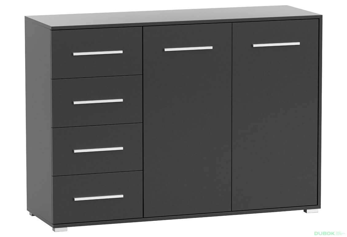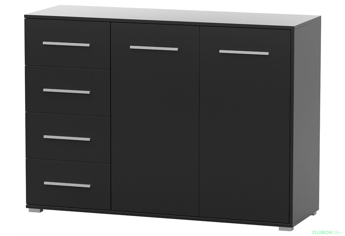 Komoda Frida 01 135 2D4S čierna je moderný a funkčný kus nábytku, ktorý sa skvele hodí do každého interiéru. S rozmermi 135 cm na šírku, 96,5 cm na výšku a 45 cm na hĺbku ponúka dostatok úložného priestoru bez toho, aby zaberala príliš veľa miesta. Jej čierny dekor a matná povrchová úprava dodávajú komode elegantný vzhľad, ktorý sa hodí do rôznych štýlov zariadenia. Komoda je vyrobená z kvalitnej drevotriesky, čo zabezpečuje jej odolnosť a dlhú životnosť. S dvoma dvierkami a štyrmi zásuvkami, vybavenými rolovacími vodítkami, je ideálna na uskladnenie rôznych predmetov, od oblečenia po dokumenty. Plastové úchytky sú praktické a zjednodušujú manipuláciu s dvierkami a zásuvkami, čím sa zvyšuje celková funkčnosť tohto nábytku. Ak hľadáte kombináciu moderného dizajnu a praktickosti, komoda Frida 01 je skvelou voľbou, ktorú nájdete na dubok.sk.