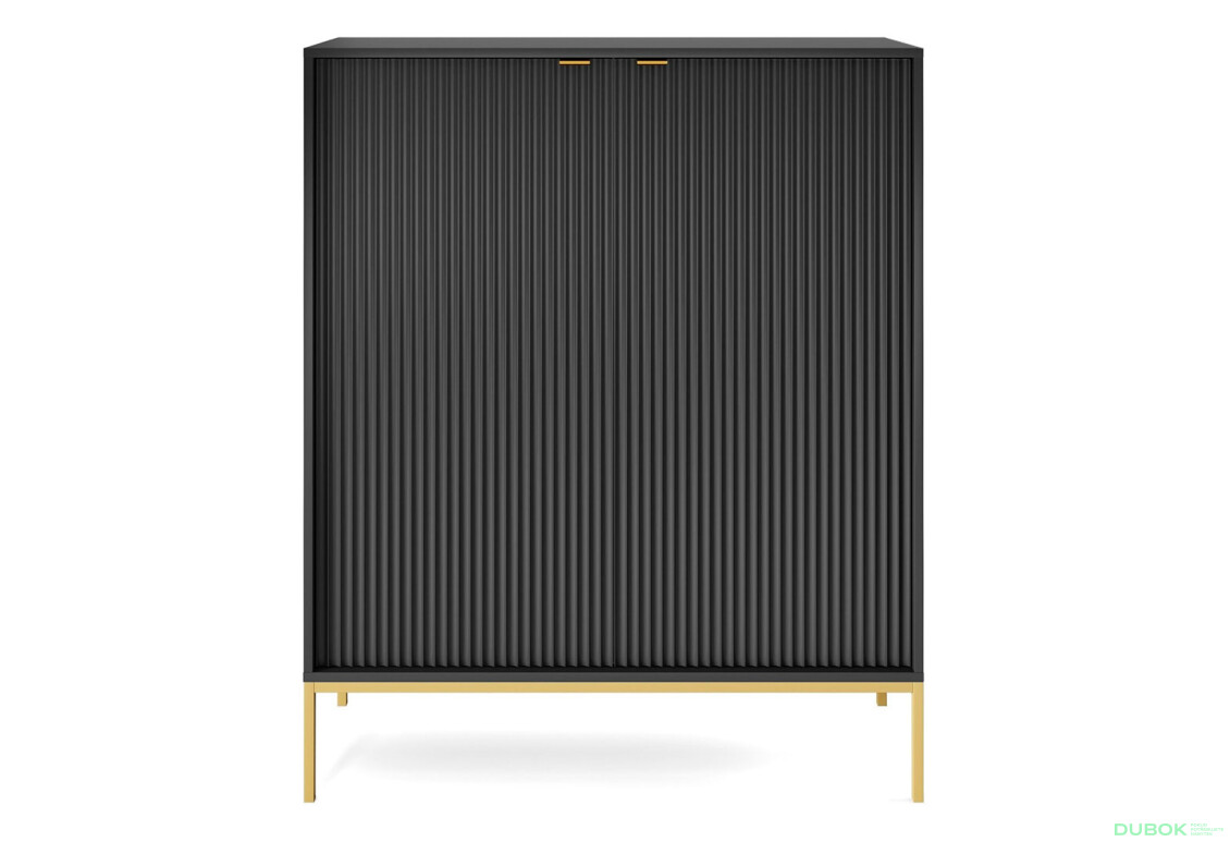 Komoda K104 čierna Nova Zlaté nohy / zlatý úchytky je ideálnym riešením pre tých, ktorí hľadajú moderný a funkčný nábytok do svojho interiéru. S elegantným škandinávskym štýlom a matným povrchom dodáva každému priestoru šmrnc a sofistikovanosť. Vyrobená z kvalitných materiálov, ako sú drevotrieska a MDF, táto komoda ponúka dostatok úložného priestoru s dvierkami a plným výsuvom zásuviek, čo zaručuje jednoduchý prístup k obsahu. Zlaté nohy a úchytky dodávajú produktu luxusný nádych, ktorý osloví každého, kto si cení kombináciu estetiky a funkčnosti. Objavte túto komodu na dubok.sk a vylepšite svoj domov.