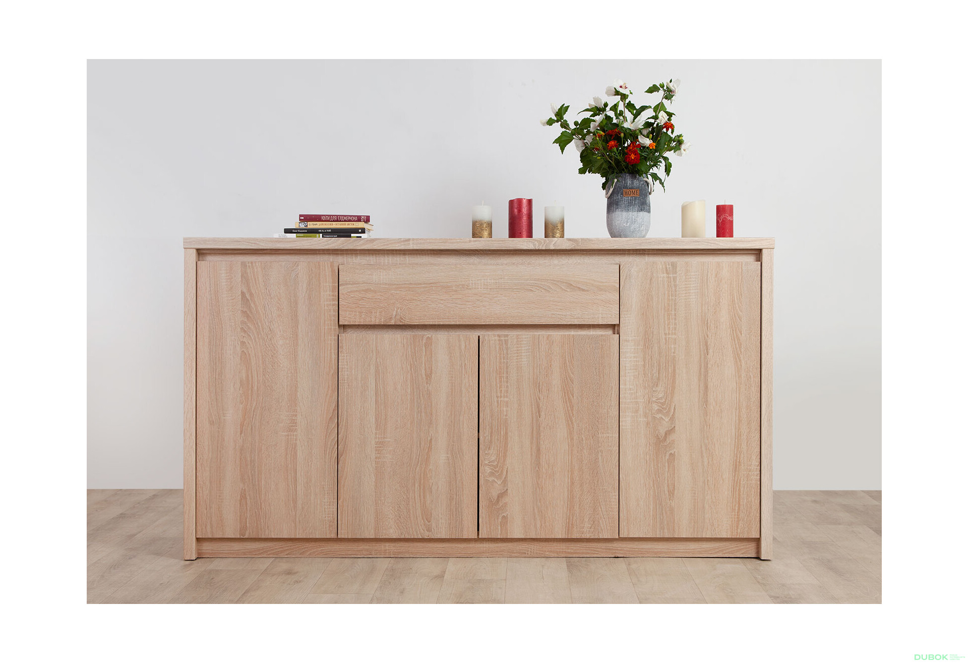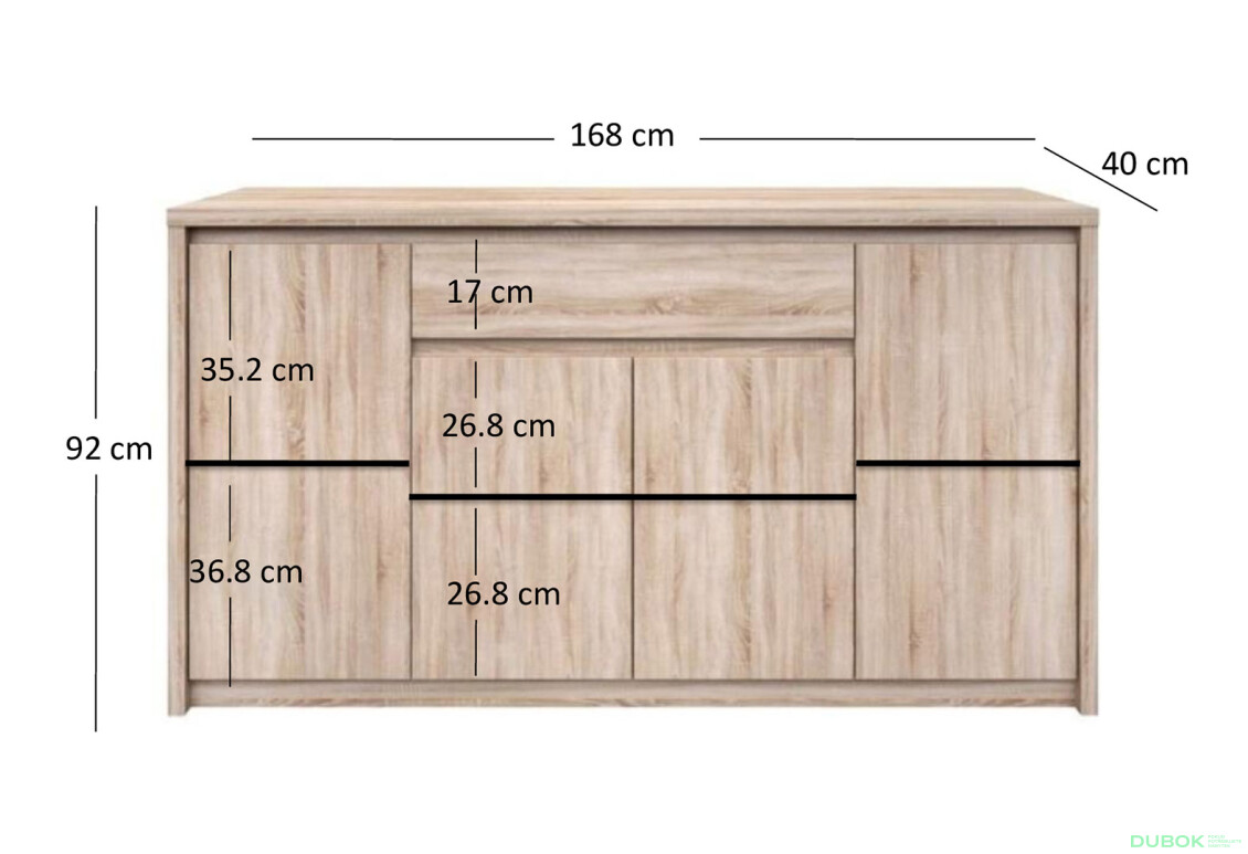 Komoda so 4 dvierkami a zásuvkou Norton 168 cm v dekore dub sonoma je ideálnym riešením pre moderné interiéry. S rozmermi 168 cm na šírku, 92 cm na výšku a 40 cm na hĺbku ponúka dostatok úložného priestoru pre vaše osobné veci, dokumenty alebo dekorácie. Vďaka svojmu elegantnému a minimalistickému dizajnu sa skvele hodí do obývačky, spálne alebo kancelárie. Komoda je vyrobená z kvalitnej drevotriesky s laminovanou povrchovou úpravou, čo zabezpečuje jej odolnosť a jednoduchú údržbu. Guličkové vedenie plného výsuvu zásuvky zabezpečuje hladké a tiché otváranie, čím zvyšuje komfort pri používaní. Na dubok.sk si môžete byť istí, že investujete do kvalitného a funkčného nábytku.