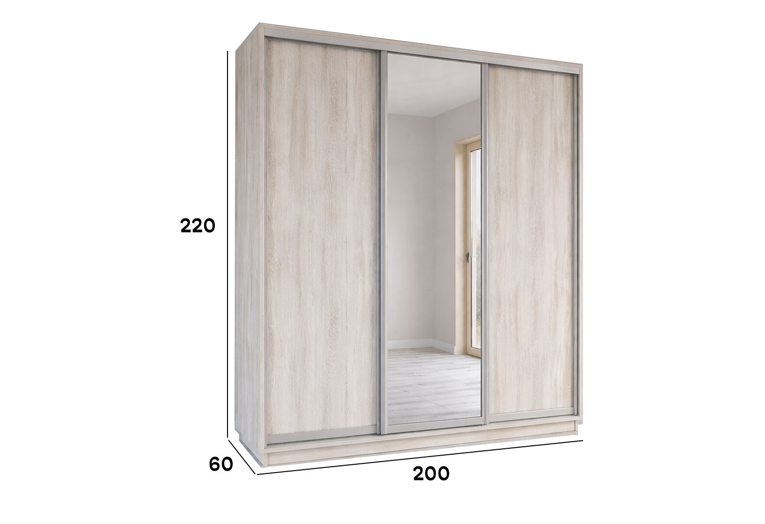 Skriňa s posuvnými dverami 2200x2000x600 2DTD 1 Zrkadlo Artwood svetlý, profil strieborný