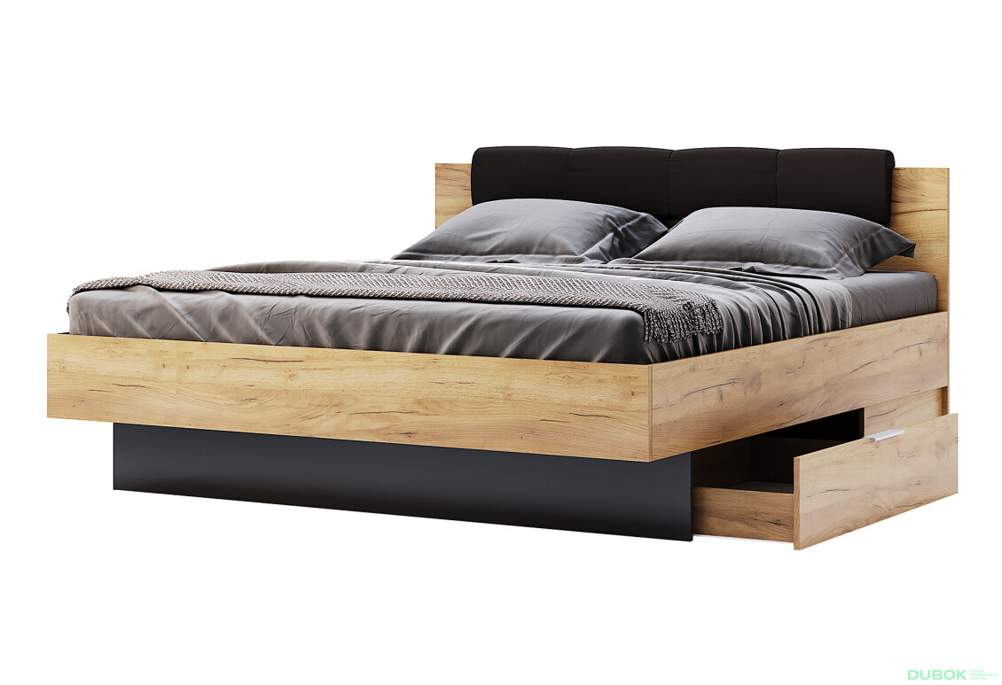 - Posteľ 180x200, čalúnené čelo so šuplíkmi (bez rámu) Lava / dub kraft Luna, 1 ks – 185.50 cm x 95.00 cm x 208.50 cm.
