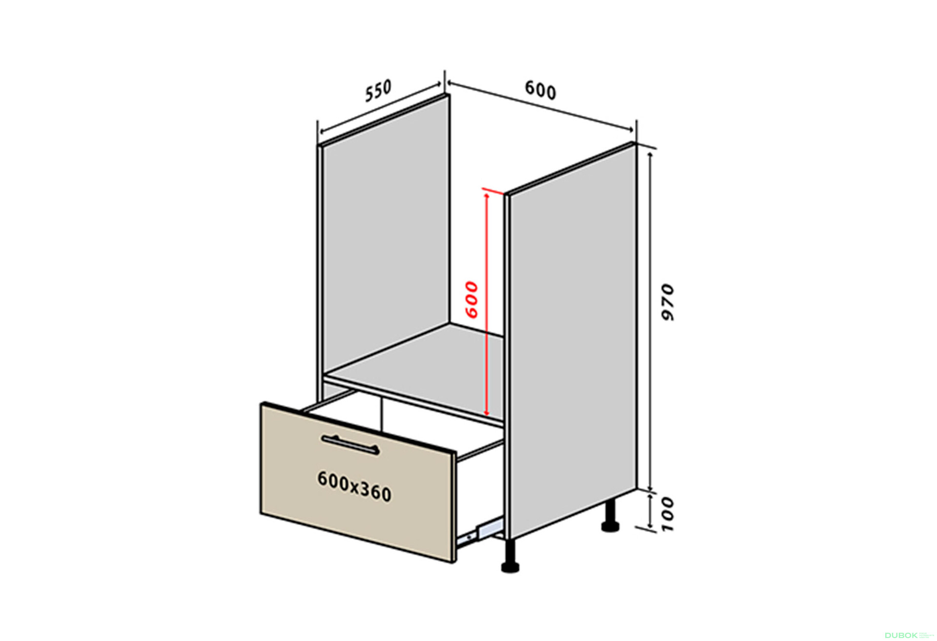 - Rozmery. S rozmermi 60 cm na šírku, 107 cm na výšku a 55 cm na hĺbku je skrinka dostatočne priestranná pre zabudovanie rúry a ďalších kuchynských spotrebičov.