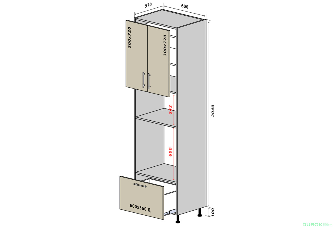 - Veľkosť. Šírka 60 cm, výška 214 cm a hĺbka 57 cm poskytuje dostatok úložného priestoru pre vaše kuchynské potreby.