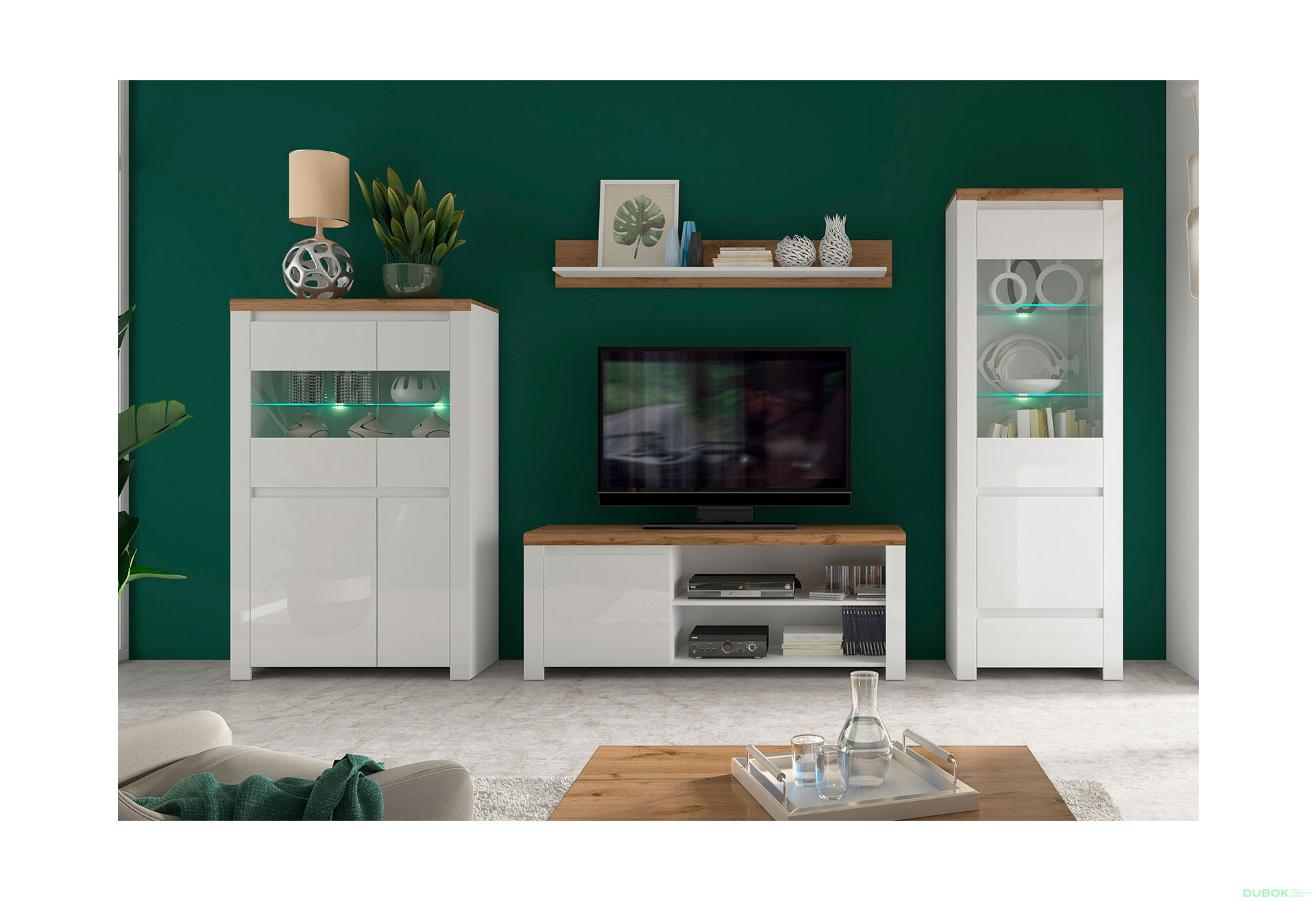 - Vitrína nízka 2d2w biely lesk / dub wotan Vigo, 1 ks – 98.00 cm x 156.00 cm x 41.50 cm