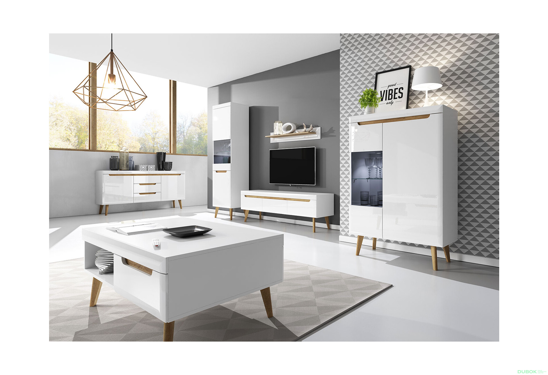 Obývacia zostava I Nordi biela / biely lesk je ideálnym riešením pre moderné obývacie izby, kde sa kladie dôraz na funkčnosť a estetiku. S jej elegantným lesklým povrchom a presklenými dvierkami ponúka nielen dostatok úložného priestoru, ale aj atraktívny vzhľad, ktorý osvieži každý interiér. Zostava je vyrobená z kvalitných materiálov, ako sú drevotrieska a MDF, pričom nohy sú z pevného dreva, čo zaručuje stabilitu a dlhú životnosť. Možnosť osvetlenia políc pridáva na funkčnosti a atmosfére, čím sa stáva skvelým doplnkom do vašej domácnosti.