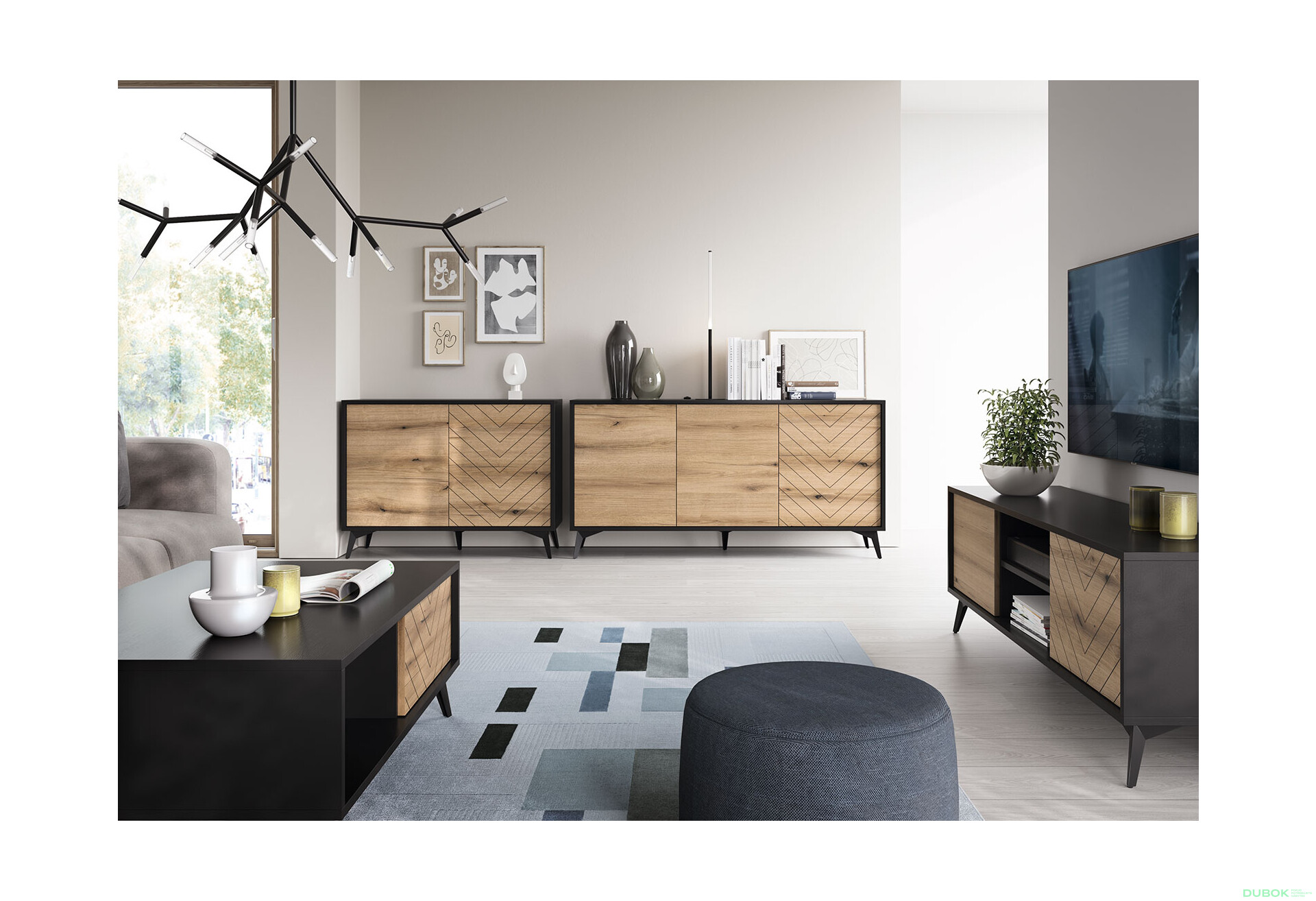 Obývacia zostava II evoke dub / čierna Diamond je ideálnym riešením pre tých, ktorí hľadajú moderný a funkčný nábytok do svojho obývacieho priestoru. Tento elegantný nábytkový set v škandinávskom štýle kombinuje kvalitné materiály a praktické riešenia. S povrchovou úpravou z laminovanej drevotriesky a kovovými nohami ponúka nielen estetický vzhľad, ale aj dlhú životnosť. Vďaka push to open úchytkám a guličkovým vedením plného výsuvu sú zásuvky a dvierka veľmi pohodlné na používanie, čo zaručuje bezproblémový prístup k uloženým veciam.