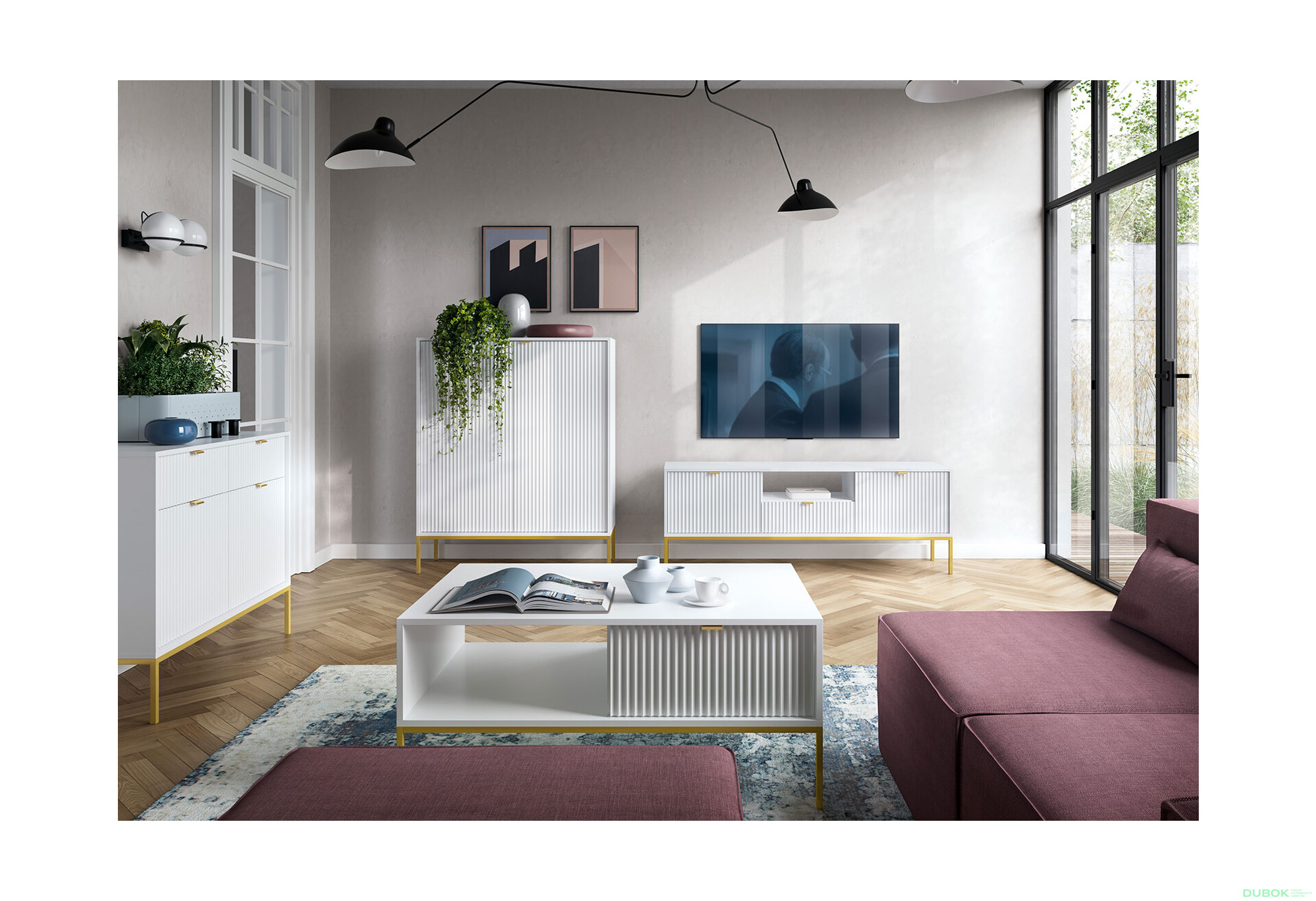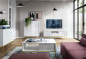 Obývacia zostava IV v bielej farbe s elegantnými zlatými nohami a úchytkami je ideálnym riešením pre moderné obývacie izby. Jej škandinávsky štýl dodáva priestoru sviežosť a útulnosť, pričom matná povrchová úprava zabezpečuje, že nábytok pôsobí vkusne a nadčasovo. Zostava obsahuje TV stolík, komody a konferenčný stolík, ktoré sú navrhnuté tak, aby spĺňali všetky vaše potreby a zároveň skvele ladili s ostatným zariadením. Kvalitné materiály, ako sú drevotrieska a MDF, zaručujú dlhú životnosť a odolnosť voči každodennému používaniu. Vďaka guličkovým vedeniam s plným výsuvom sú zásuvky pohodlné na používanie a poskytujú dostatok úložného priestoru.