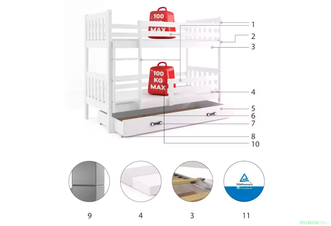 Poschodová posteľ Carino biele, zásuvka modrý 80x190 cm s roštom a matracom je ideálnym riešením pre detské izby, kde je potrebné efektívne využiť priestor. Tento moderný kus nábytku kombinuje funkčnosť a estetiku, pričom poskytuje pohodlné a bezpečné miesto na spanie pre dve osoby. Vyrobená z kvalitnej borovice, posteľ je nielen robustná, ale aj štýlová, vďaka elegantnému bielému dekoru a lakovanej povrchovej úprave, ktorá zabezpečuje jej dlhú životnosť a jednoduchú údržbu. Maximálne zaťaženie na jedno lôžko je 100 kg, čo zaručuje bezpečné používanie aj pre staršie deti. Posteľ je vybavená praktickým úložným priestorom, ktorý umožňuje uchovávať hračky alebo posteľnú bielizeň, čím prispieva k udržiavaniu poriadku v izbe.