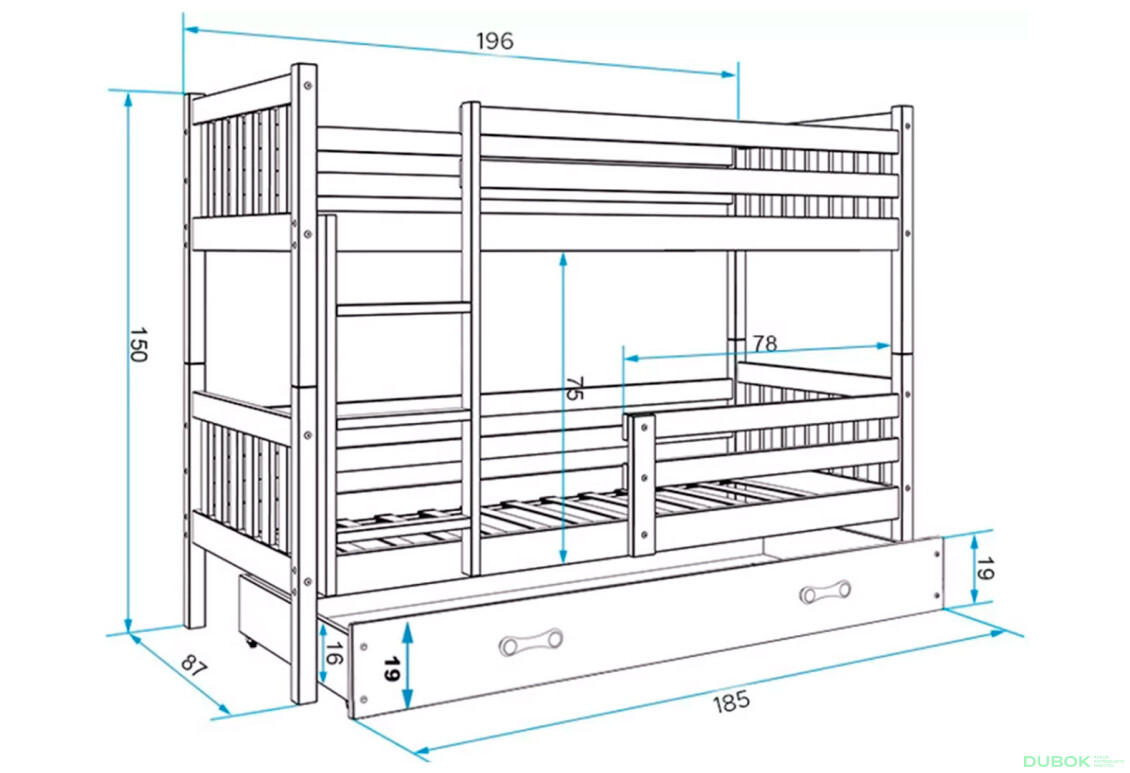 Poschodová posteľ Carino v elegantnom grafitovom dekore je ideálnym riešením pre detské alebo študentské izby, kde je potrebné efektívne využiť priestor. S rozmermi 80x190 cm ponúka dostatok miesta pre dve osoby a vďaka robustnej konštrukcii z borovicového dreva zaručuje dlhú životnosť a stabilitu. Lakovaná povrchová úprava nielenže dodáva posteli moderný vzhľad, ale aj uľahčuje údržbu a čistenie. S maximálnym zaťažením 100 kg na jedno lôžko je táto posteľ vhodná pre rôzne vekové kategórie, pričom zachováva vysoký štandard kvality a bezpečnosti. Navyše, posteľ je vybavená praktickým úložným priestorom, čo je ďalším benefitom pre rodiny, ktoré potrebujú uskladniť hračky, oblečenie alebo iné predmety. Všetky tieto vlastnosti robia z postele Carino skvelú voľbu pre moderné a funkčné zariadenie interiéru.