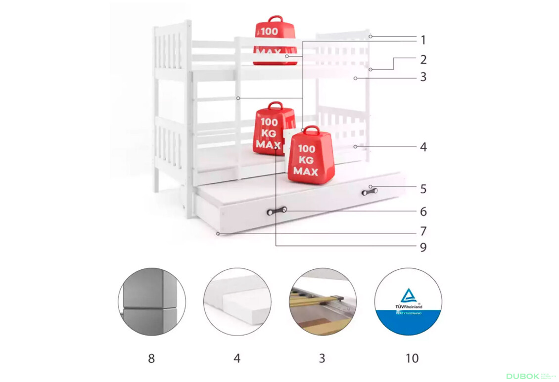- Maximálne zaťaženie na jedno lôžko. S maximálnym zaťažením 100 kg na jedno lôžko je posteľ vhodná pre deti aj dospelých, pričom poskytuje bezpečné a pohodlné spanie.