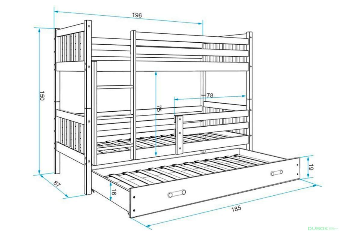 Recenzie - Poschodová posteľ Carino pre tri osoby borovice, zásuvka biela 80x190 cm s roštom, matracom (0)