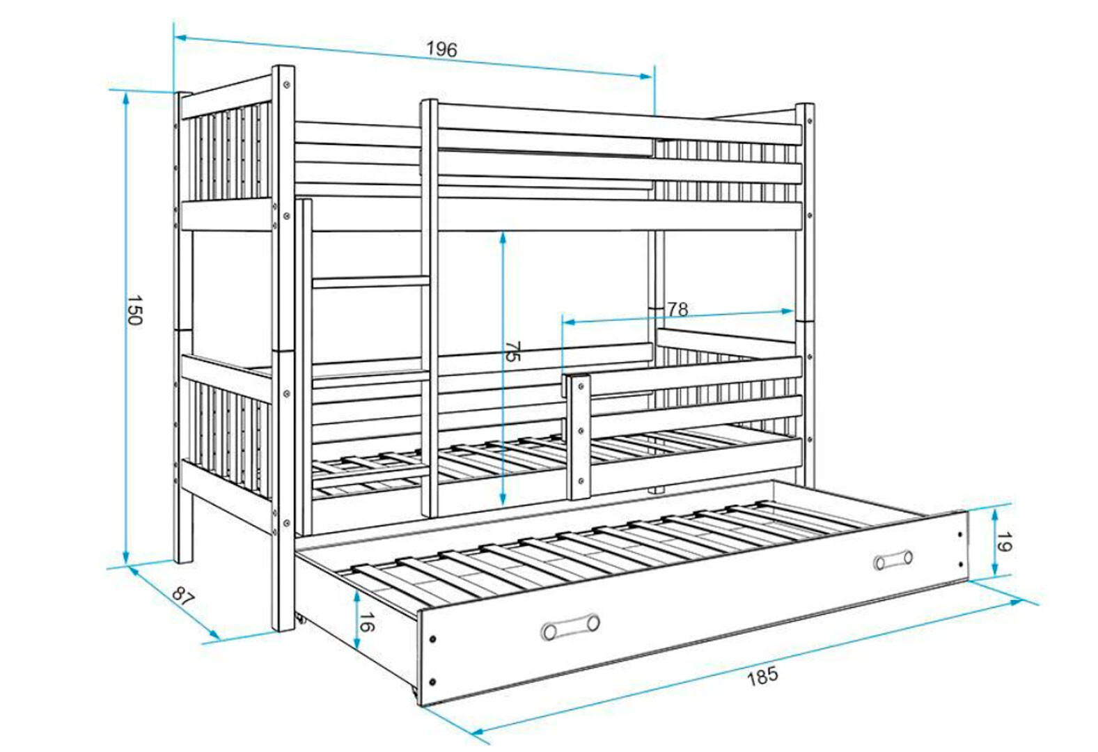 Fotografia 3 - Poschodová posteľ Carino pre tri osoby grafit, zásuvka grafit 80x190 cm s roštom, matracom