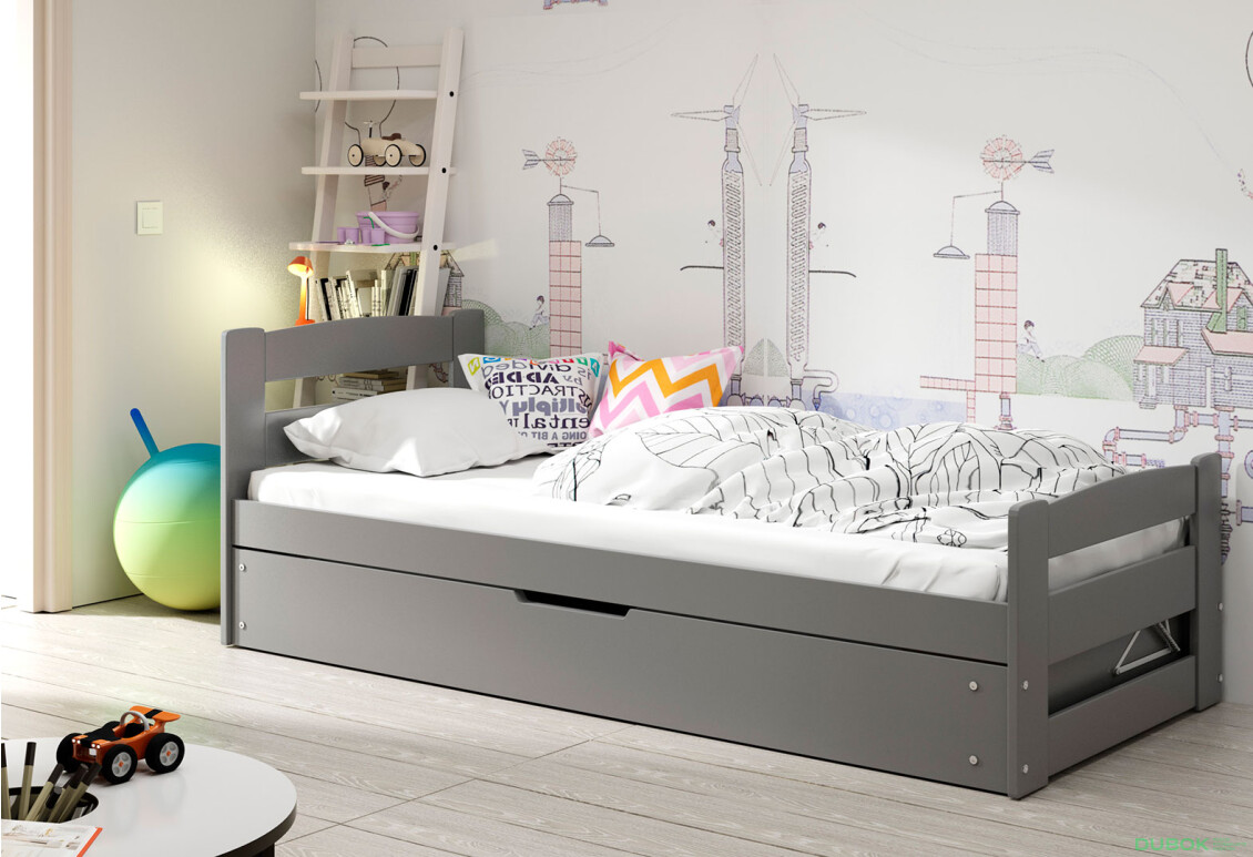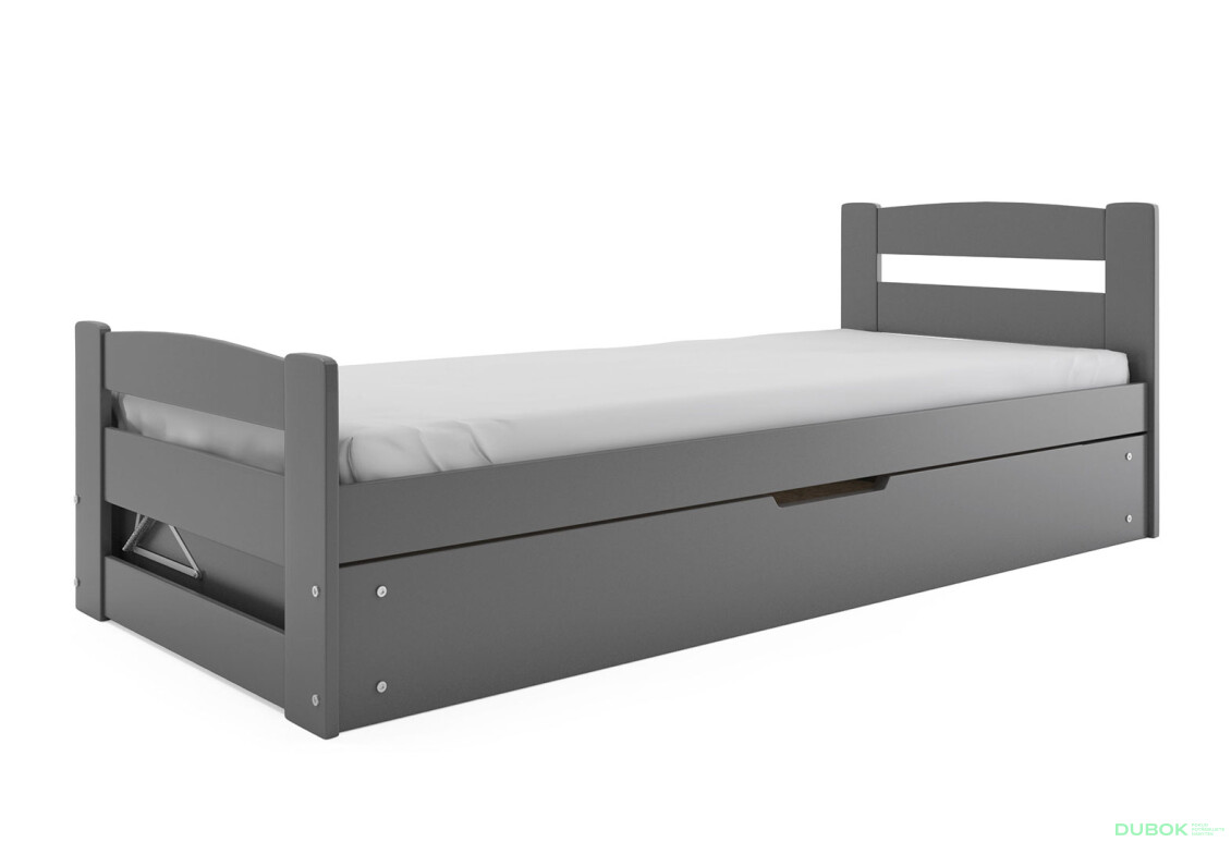 Posteľ Erni grafit 90x200 cm s roštom a matracom je ideálnym riešením pre každú detskú izbu. Svojím moderným a elegantným dizajnom v grafitovej farbe sa perfektne hodí do rôznych interiérov. Posteľ je vyrobená z kvalitnej borovice, čo zaručuje jej dlhú životnosť a odolnosť. Vďaka výklopnému mechanizmu je jednoduché manipulovať s lôžkom a udržiavať poriadok v izbe. Posteľ je navrhnutá pre maximálne zaťaženie 100 kg, čo z nej robí spoľahlivú voľbu pre deti aj dospievajúcich. S rozmermi 90x200 cm poskytuje dostatok priestoru na pohodlný spánok, zatiaľ čo lakovaná povrchová úprava zabezpečuje jednoduchú údržbu a ochranu dreva pred poškodením. Všetky tieto vlastnosti robia z postele Erni skvelý doplnok do každej izby, kde sa cení moderný vzhľad a funkčnosť.