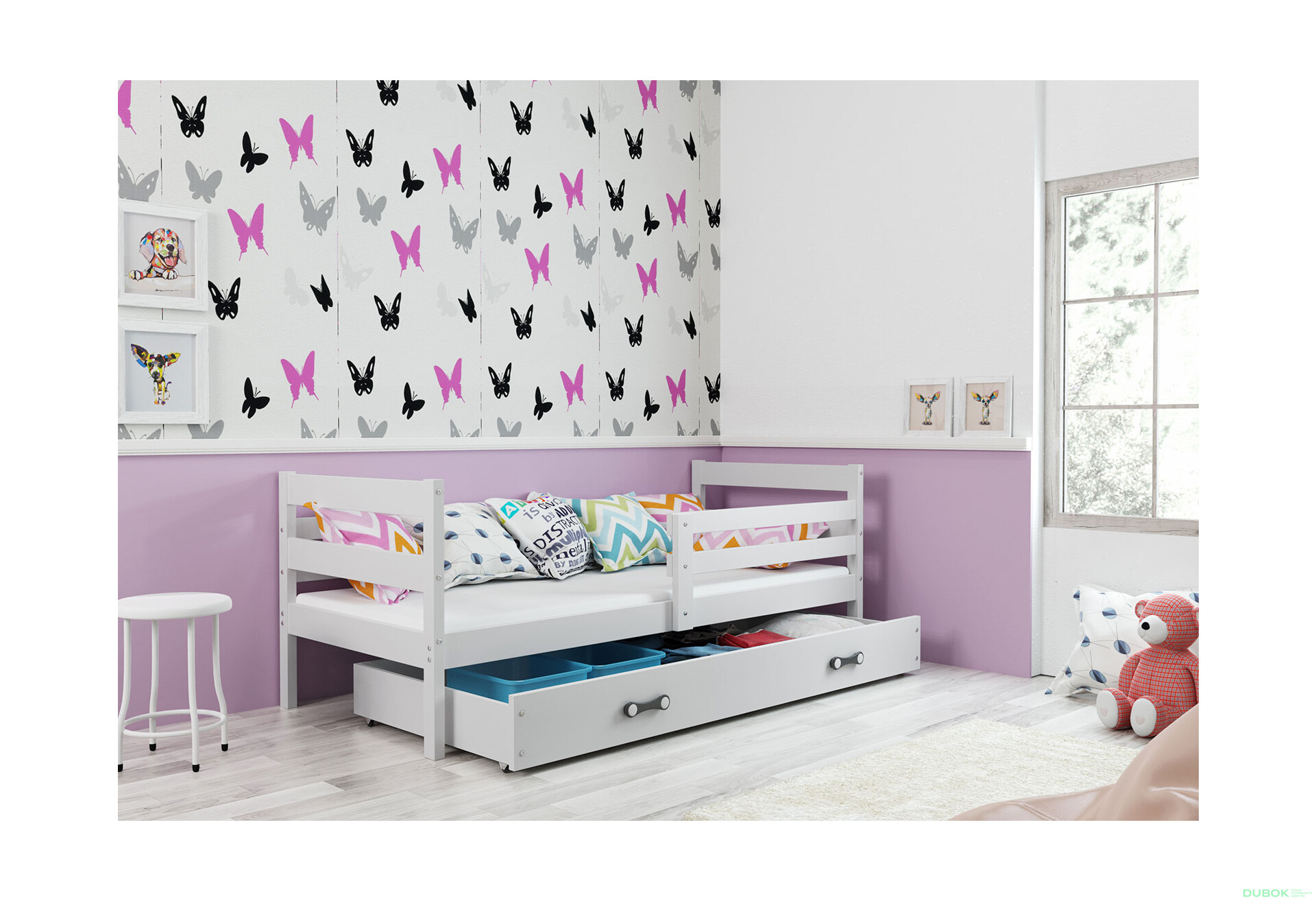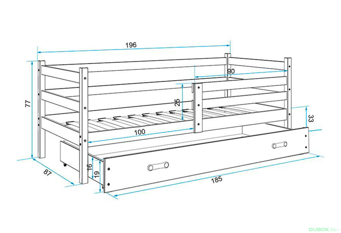 - Úložný priestor. Praktická výsuvná zásuvka ponúka dodatočný priestor na uskladnenie hračiek alebo iných predmetov, čím šetrí miesto v izbe.