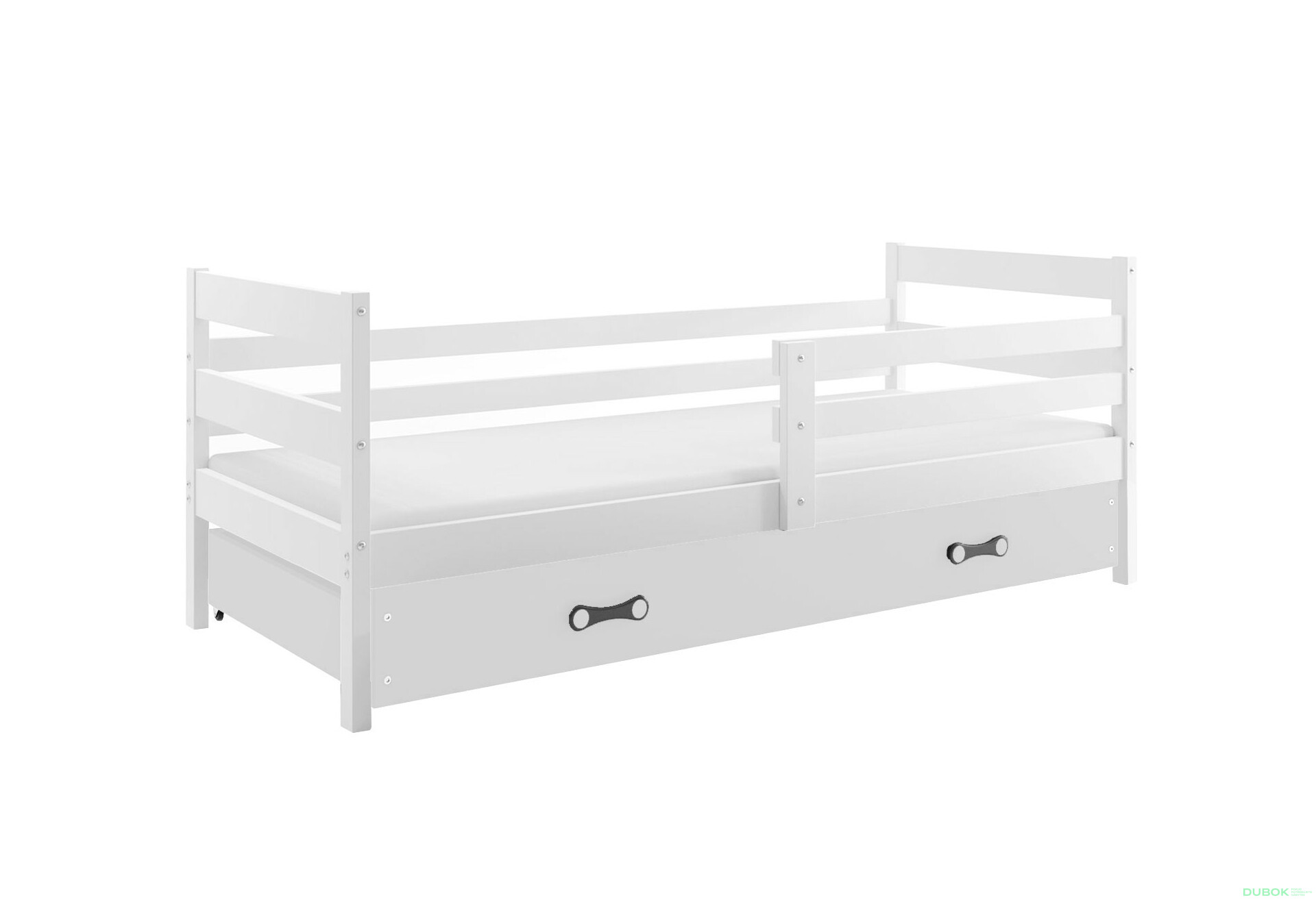 Posteľ Eryk biele, zásuvka biela 80x190 cm s roštom, matracom je ideálnym riešením pre detské izby, ktoré potrebujú praktický a moderný nábytok. Tento produkt spája funkčnosť s príjemným dizajnom, ktorý osloví každého. Posteľ je vyrobená z kvalitnej borovice, čo zaručuje jej odolnosť a dlhú životnosť. Biela farba dekoru a lakovaná povrchová úprava dodávajú posteli elegantný vzhľad, ktorý sa hodí do každého interiéru. S rozmermi 80x190 cm poskytuje dostatok priestoru na spanie a maximálne zaťaženie 100 kg zaručuje, že je bezpečná aj pre aktívne deti. Praktická výsuvná zásuvka ponúka dodatočný úložný priestor na hračky alebo posteľnú bielizeň, čím prispieva k udržiavaniu poriadku v izbe. S bočnicami a roštom je posteľ nielen stabilná, ale aj pohodlná pre každodenné používanie. Objednajte si posteľ Eryk na dubok.sk a vytvorte svojmu dieťaťu útulný priestor na spanie a hranie.