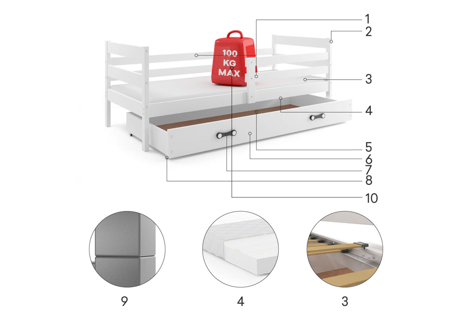 Fotografia 4 - Posteľ Eryk biele, zásuvka zelená 90x200 cm s roštom, matracom