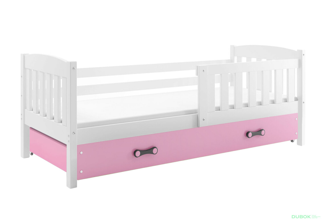 Posteľ Kubus biele, zásuvka ružová 90x200 cm s roštom a matracom je ideálnym riešením pre detské izby. Jej moderný a štýlový dizajn v kombinácii bielej a ružovej farby vytvára príjemnú atmosféru, ktorá osloví každého malého obyvateľa. Posteľ je vyrobená z kvalitnej borovice, čo zaručuje jej pevnosť a dlhú životnosť. S rozmermi 90x200 cm poskytuje dostatok priestoru na spanie a pohodlie pre vaše dieťa. Drevený rám postele je vybavený roštom, čo zvyšuje komfort pri spánku a podporuje zdravý spánkový režim. Okrem toho je posteľ vybavená praktickou výsuvnou zásuvkou, ktorá ponúka dodatočný úložný priestor na hračky, oblečenie alebo iné potrebné veci, čím pomáha udržiavať poriadok v izbe.