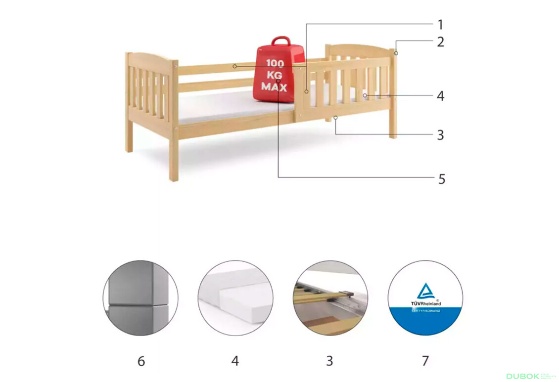 Posteľ Kubus borovice 80x160 cm s roštom a matracom je ideálnym riešením pre detské izby, kde sa kladie dôraz na moderný dizajn a funkčnosť. Táto posteľ ponúka pohodlné miesto na spanie pre jedno dieťa, pričom jej rozmer 80x160 cm je prispôsobený pre rastúce potreby detí. Vyrobená z kvalitnej borovice, táto posteľ je nielen esteticky príjemná, ale aj veľmi odolná. Lakovaná povrchová úprava zabezpečuje, že je posteľ ľahko udržiavateľná a odolná voči bežnému opotrebovaniu. S maximálnym zaťažením 100 kg je posteľ dostatočne pevná, aby zvládla každodenné používanie. Bez úložného priestoru, posteľ sa sústreďuje na jednoduchý a čistý dizajn, ktorý sa hodí do každého detského interiéru. Vďaka svojmu drevenému rámu a prednej strane dodáva izbe prírodný nádych.