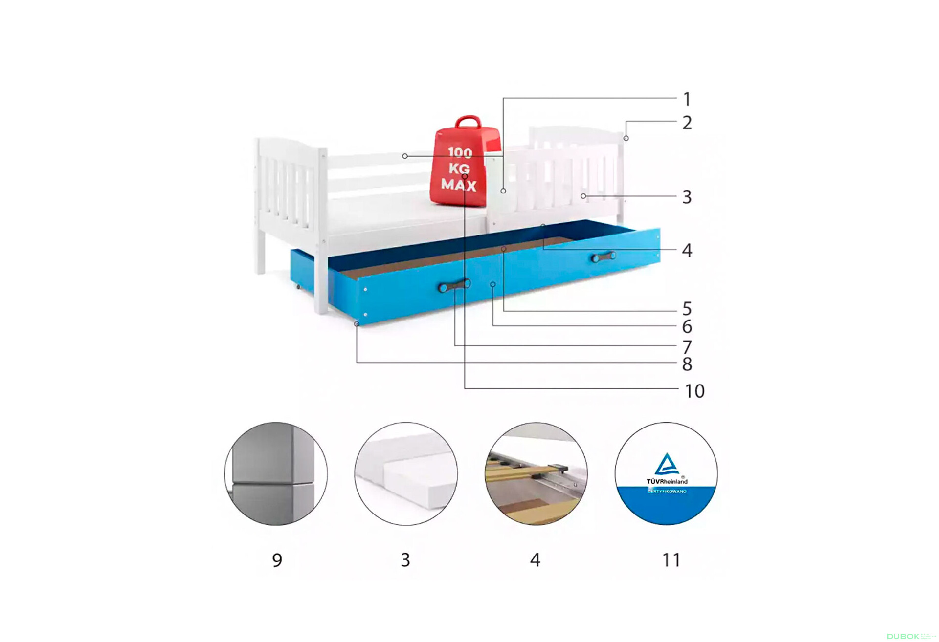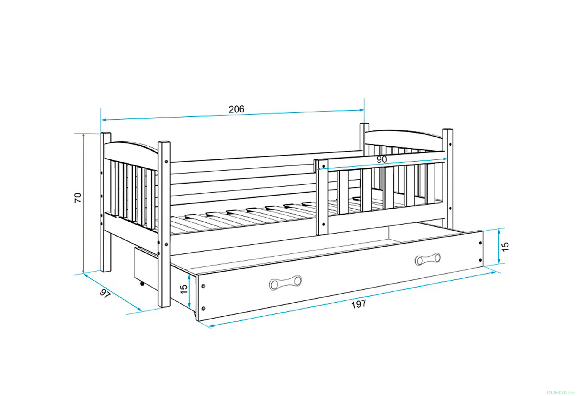 - Úložný priestor. S výsuvnou zásuvkou poskytuje praktický úložný priestor na hračky, posteľnú bielizeň alebo iné potrebné veci, čím pomáha udržiavať poriadok v izbe.