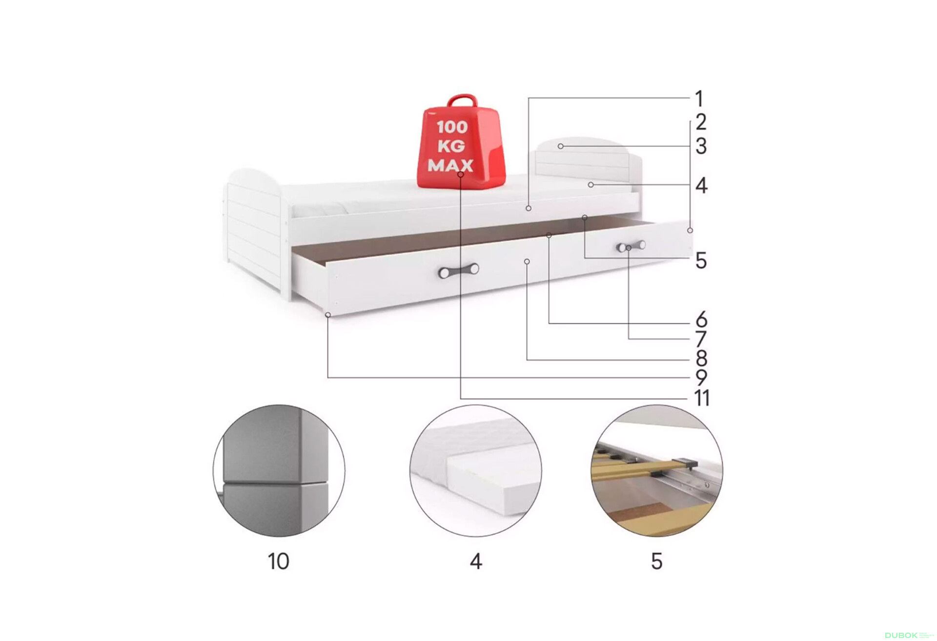 - Úložný priestor. S výsuvnou zásuvkou ponúka praktické riešenie pre uskladnenie hračiek a iných predmetov, čím udržiava izbu v poriadku.