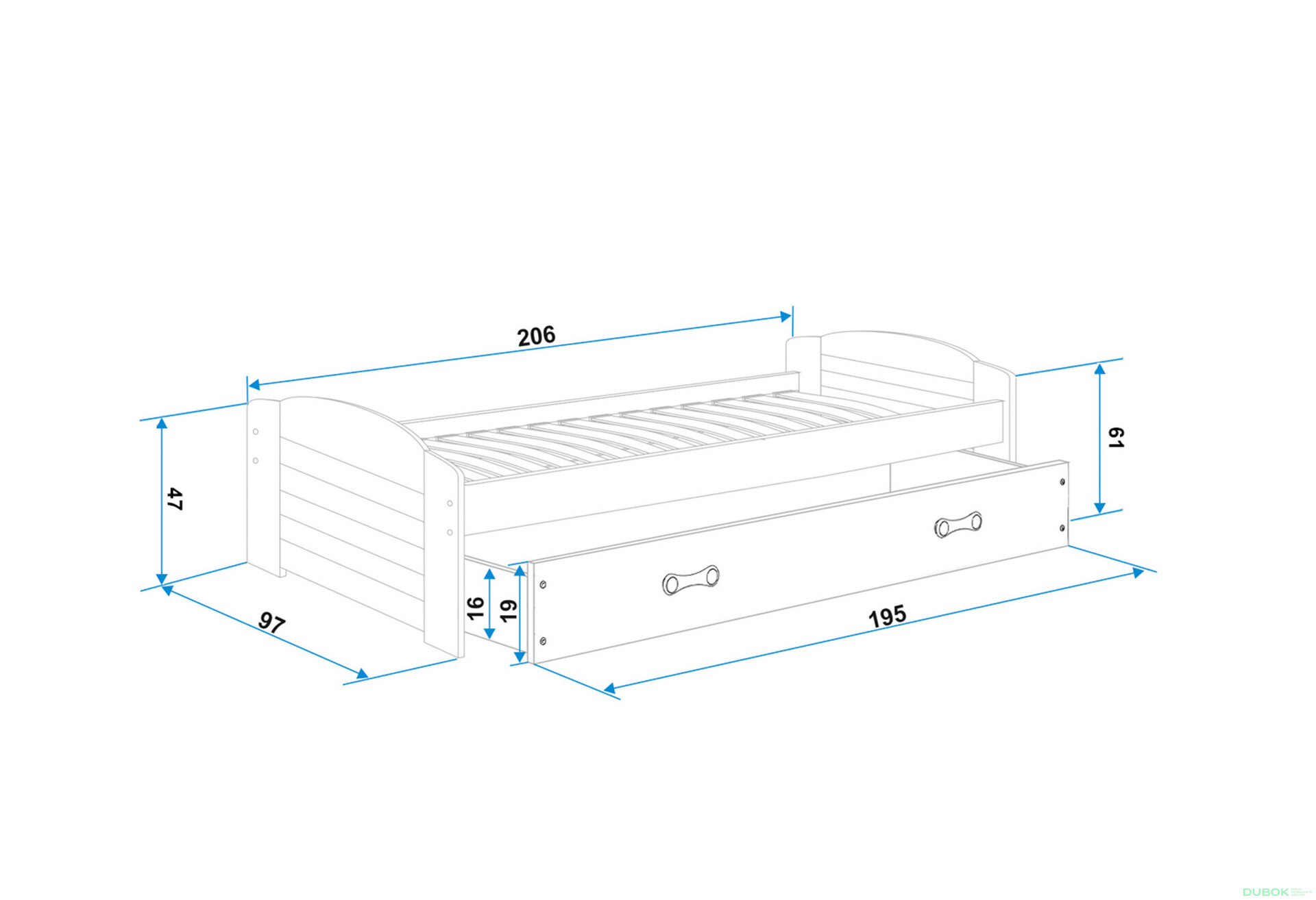 - Veľkosť. Posteľ má šírku 97 cm, výšku 61 cm a hĺbku 206 cm, čo z nej robí ideálny kúsok nábytku pre detské izby.