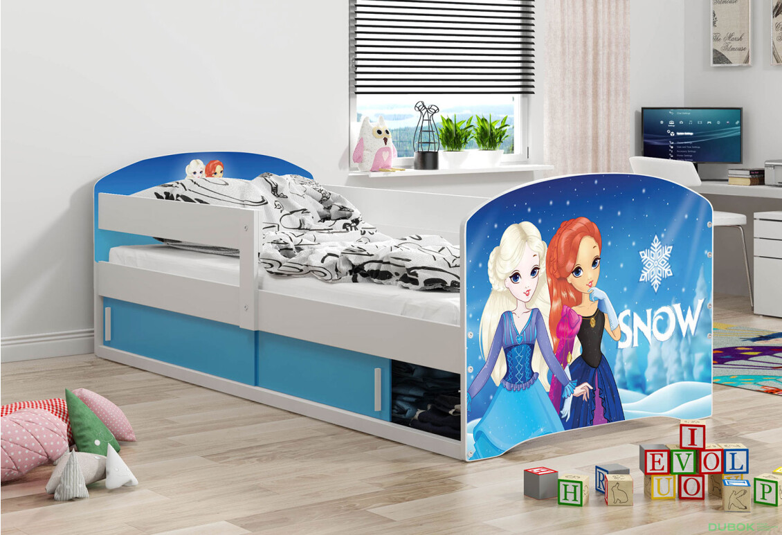 Posteľ Luki 1 biele Frozen 80x160 cm s roštom a matracom je ideálnym riešením pre detské izby, kde sa snúbi moderný dizajn s praktickými funkciami. Tento kus nábytku je navrhnutý tak, aby poskytoval maximálny komfort a bezpečnosť pre vaše deti. Je vyrobený z kvalitnej borovice, čo zaručuje dlhú životnosť a odolnosť. Lakovaná povrchová úprava zabezpečuje jednoduchú údržbu a ochranu pred poškodením. Posteľ je vybavená výsuvnou zásuvkou, ktorá ponúka dodatočný úložný priestor na hračky alebo posteľnú bielizeň, čím pomáha udržiavať poriadok v detskej izbe. S rozmermi 80x160 cm je ideálna pre deti, pričom maximálne zaťaženie na jedno lôžko je až 100 kg, čo zaručuje bezpečné a stabilné spanie.