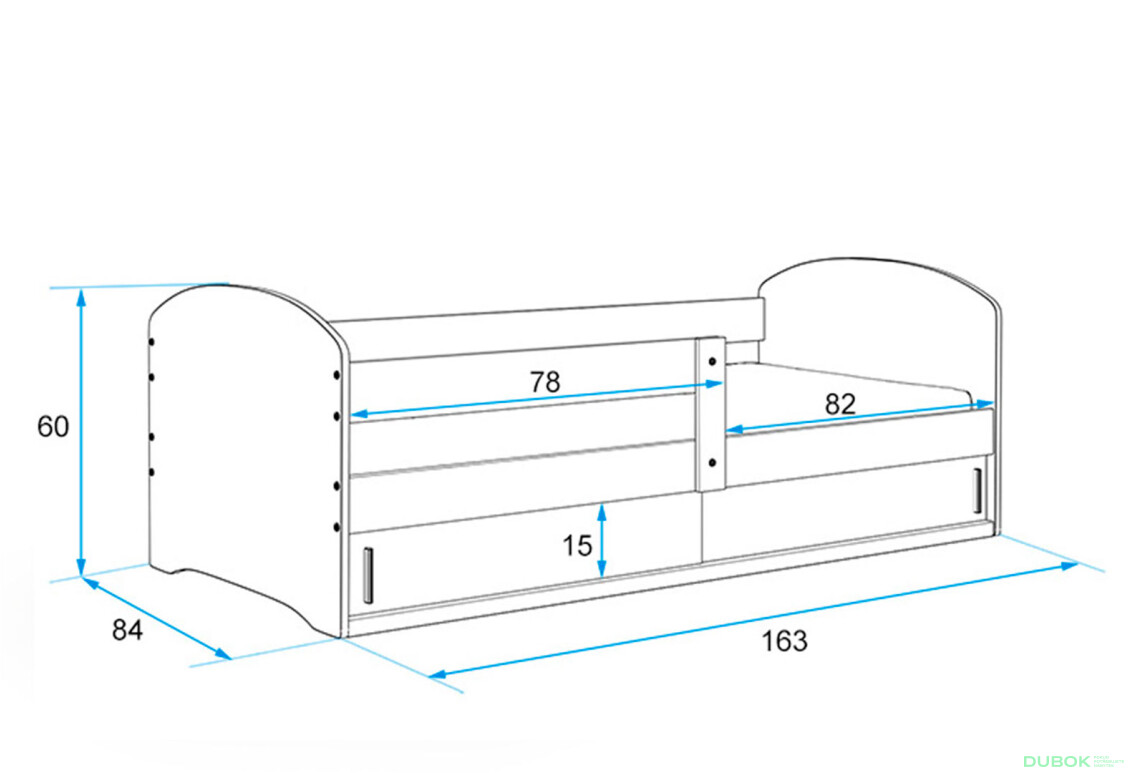 - Typ jednolôžkovej postele. Posteľ je navrhnutá s bočnicami a výsuvnou zásuvkou, čo zvyšuje jej funkčnosť a bezpečnosť pre deti.