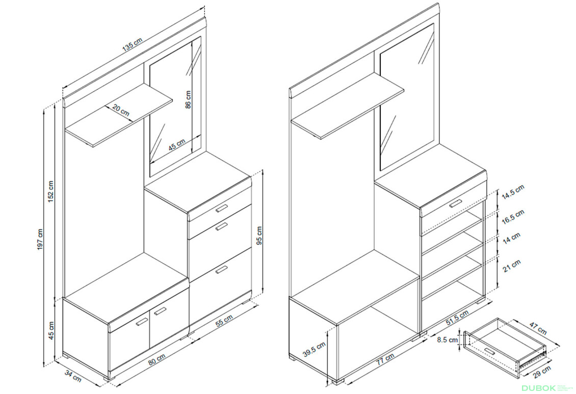 - Veľkosť. S rozmermi 135 cm na šírku, 197 cm na výšku a 34 cm na hĺbku ponúka dostatok úložného priestoru pre všetky vaše potreby.