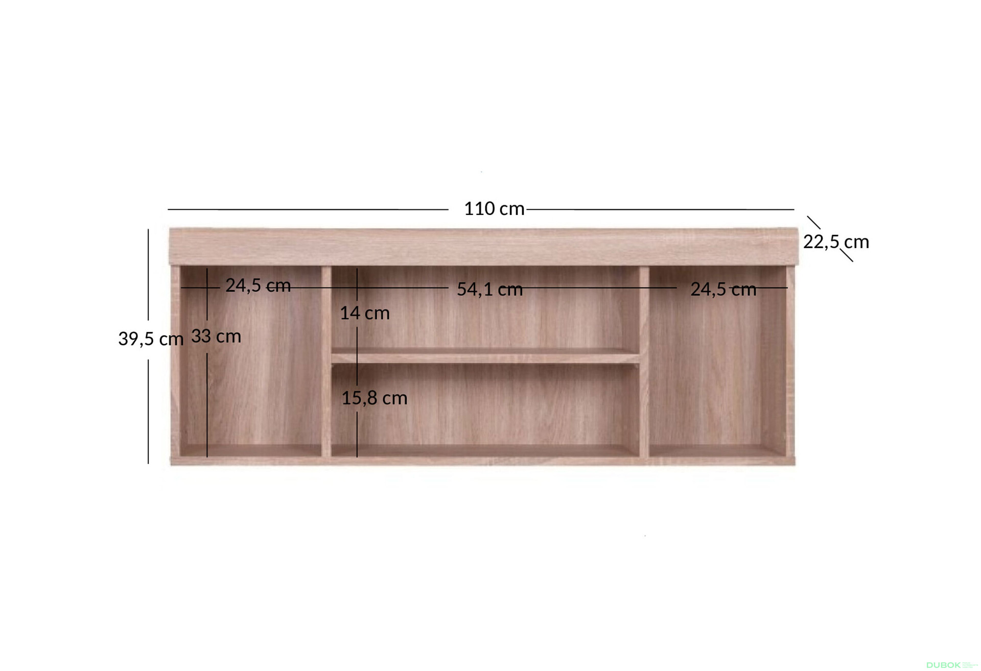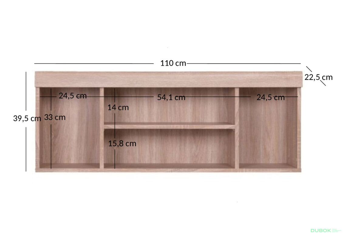 - Veľkosť. S rozmermi 110 cm x 39 cm x 22,5 cm je regál dostatočne priestranný, aby splnil vaše potreby bez zbytočného zaťaženia priestoru.