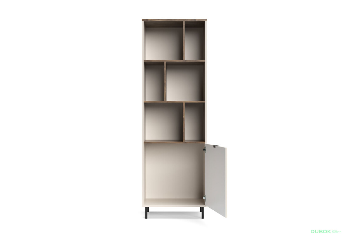 Otvorený regál 1d [EO5] v elegantnej kombinácii kašmíru a dubu castello je ideálnym riešením pre moderné interiéry. S rozmermi 63,4 cm na šírku, 135,2 cm na výšku a 40 cm na hĺbku ponúka dostatok priestoru na uskladnenie vašich kníh, dekorácií alebo osobných predmetov. Tento regál vyniká svojím kombinovaným vzhľadom knižnice a moderným štýlom, ktorý skvele zapadne do obývacích izieb, kancelárií či študentských izieb. Kvalitná laminovaná povrchová úprava zabezpečuje odolnosť voči poškriabaniu a jednoduchú údržbu. Kovové nohy dodávajú stabilitu a moderný vzhľad, zatiaľ čo kovová nábytková úchytka poskytuje praktické a štýlové riešenie pre otváranie a zatváranie.