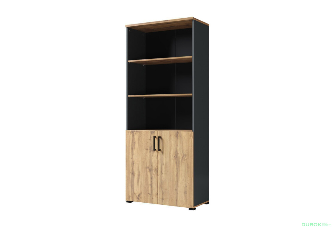 Regál 2D v elegantnej kombinácii antracit a dub wotan je ideálnym riešením pre moderné interiéry. Jeho rozmerná štruktúra s výškou 190 cm, šírkou 80 cm a hĺbkou 40 cm poskytuje dostatok úložného priestoru, pričom zachováva kompaktné rozmery. Tento regál je navrhnutý tak, aby spĺňal potreby súčasného užívateľa, a to nielen esteticky, ale aj funkčne. Vďaka laminovanej povrchovej úprave je veľmi odolný voči poškodeniu a ľahko sa udržiava. Drevotrieska, z ktorej je vyrobený, zaručuje stabilitu a dlhú životnosť. Plastové úchytky dodávajú regálu moderný vzhľad a praktickosť.