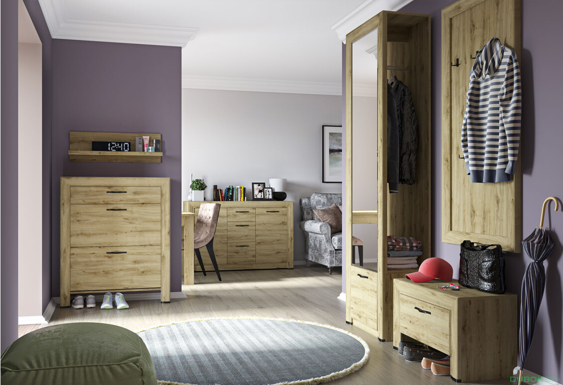 Séria do predsiene Sapori dub navarra je moderný nábytkový systém, ktorý kombinuje funkčnosť s elegantným dizajnom. Tento produkt je ideálnym riešením pre každú predsieň, kde chcete vytvoriť príjemnú atmosféru a zároveň zabezpečiť dostatok úložného priestoru. S povrchovou úpravou z laminovanej a patinovanej drevotriesky, táto séria ponúka nielen estetický zážitok, ale aj vysokú odolnosť voči opotrebeniu. Kovové úchytky a plastové nohy dodávajú nábytku moderný vzhľad a stabilitu, pričom kombinácia MDF a drevotriesky zabezpečuje potrebnú pevnosť a trvácnosť.