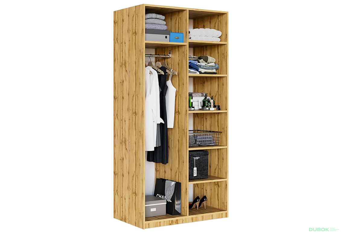 - Vnútorné usporiadanie. S policami a tyčou pod oblečenie, čo zaručuje efektívne využitie priestoru a prehľadnosť.