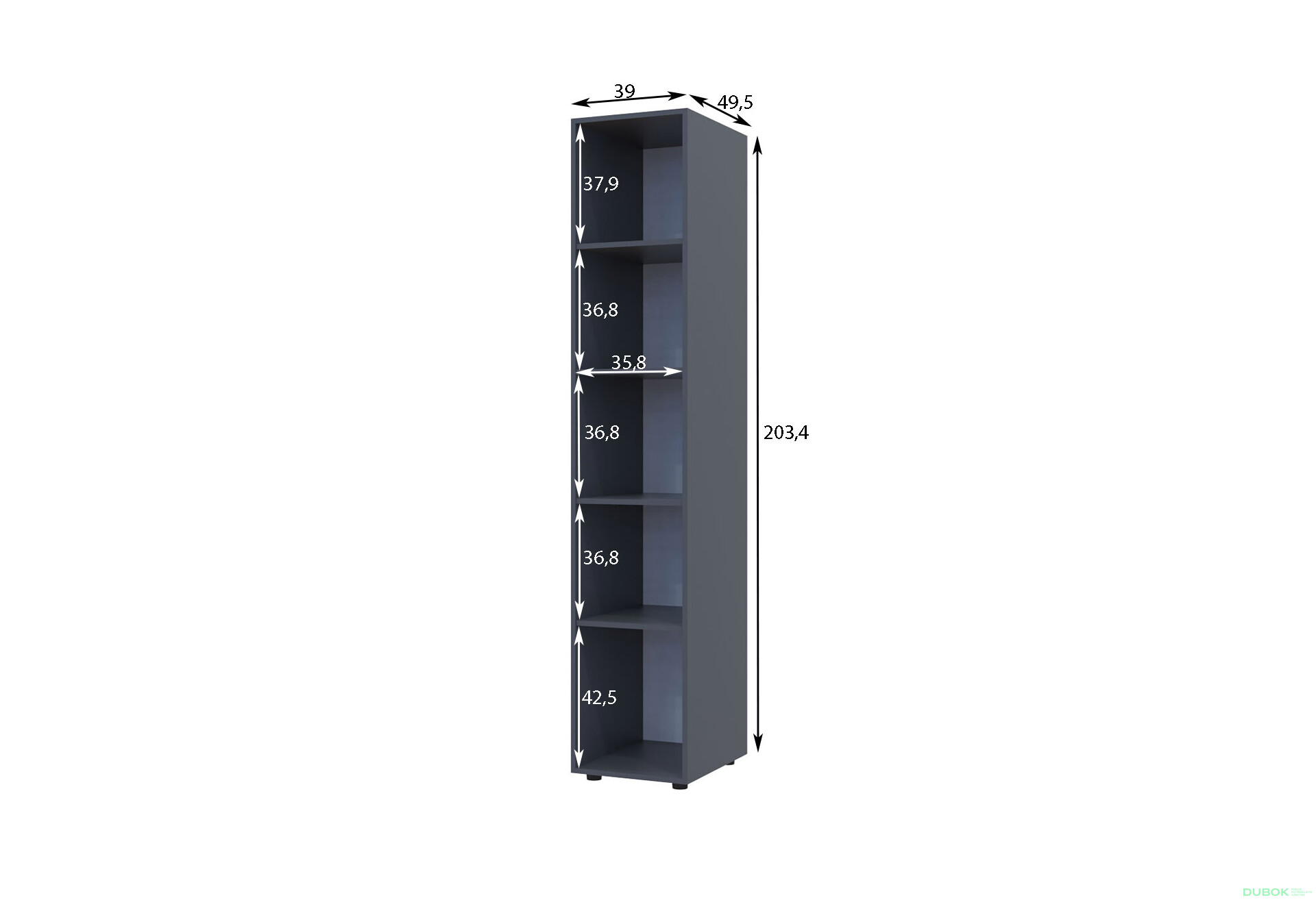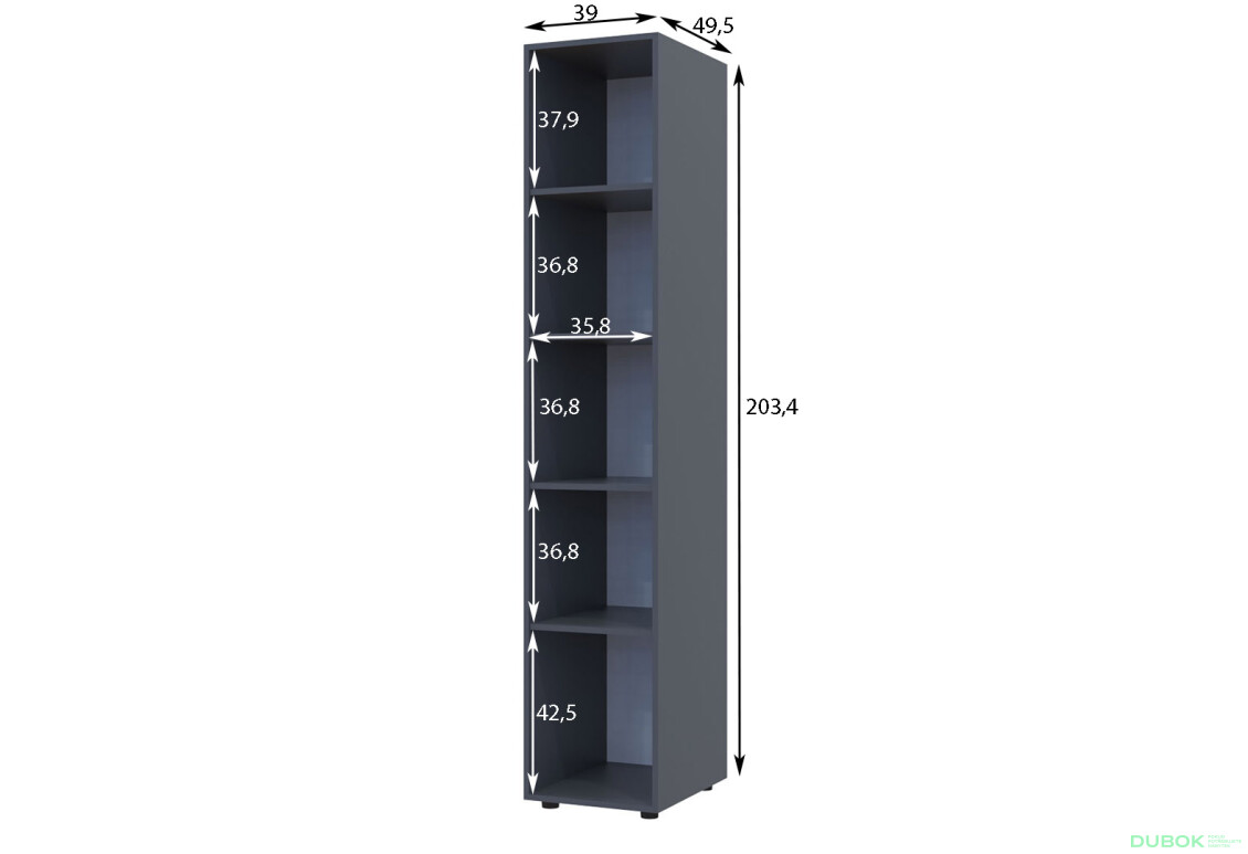 - Veľkosť. S rozmermi 39 cm na šírku, 203,4 cm na výšku a 49,5 cm na hĺbku je skriňa ideálna aj do menších priestorov.